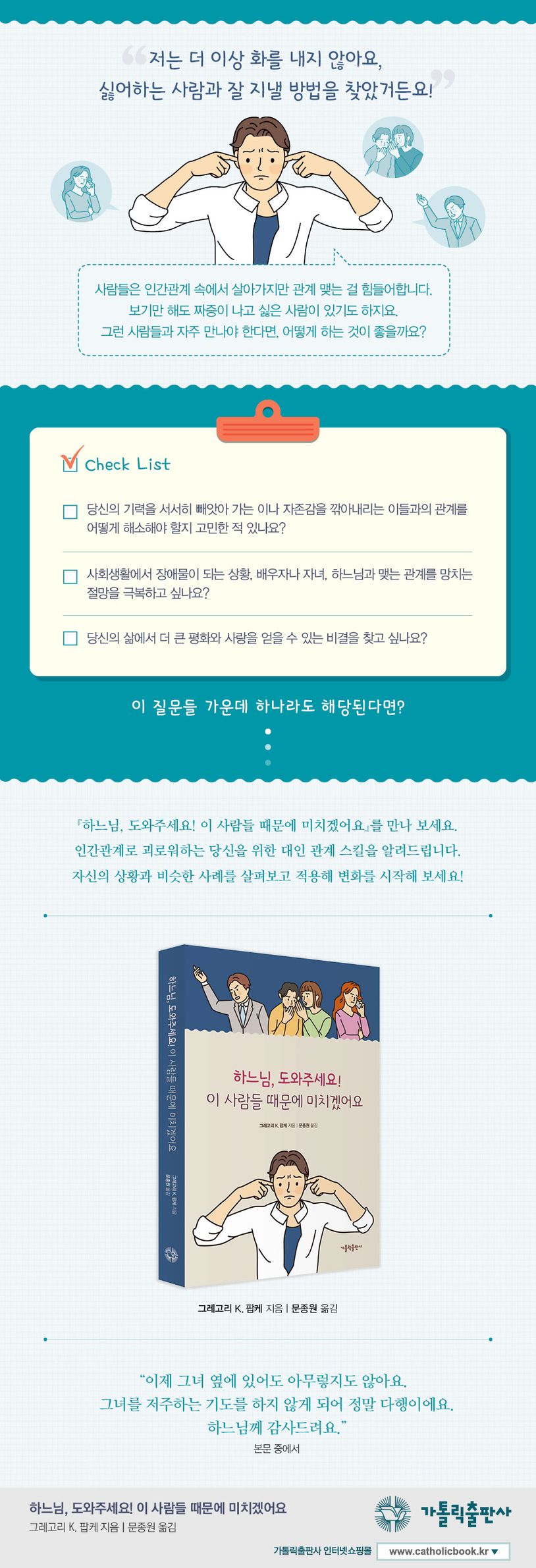 가톨릭출판사(사장 김대영 디다꼬 신부)에서는 이러한 사람들이 인간관계에서 스트레스를 받지 않도록 도와주는 책 《하느님, 도와주세요! 이 사람들 때문에 미치겠어요》를 출간했다. 이 책은 심리 상담사로 유명한 그레고리 K. 팝케 박사의 베스트셀러로서 《하느님, 도와주세요! 불안해서 죽겠어요》에 이어 국내에 출간되는 두 번째 저서다. 첫 번째 책이 현대인의 불안과 스트레스를 관리하는 방법을 담았다면 이 책은 현대인들이 가장 어려워하는 좋은 인간관계 맺는 여러 기법을 담아 마주하기 힘든 상대와도 함께 있어도 평온한 마음을 가질 수 있도록 이끌어 준다.