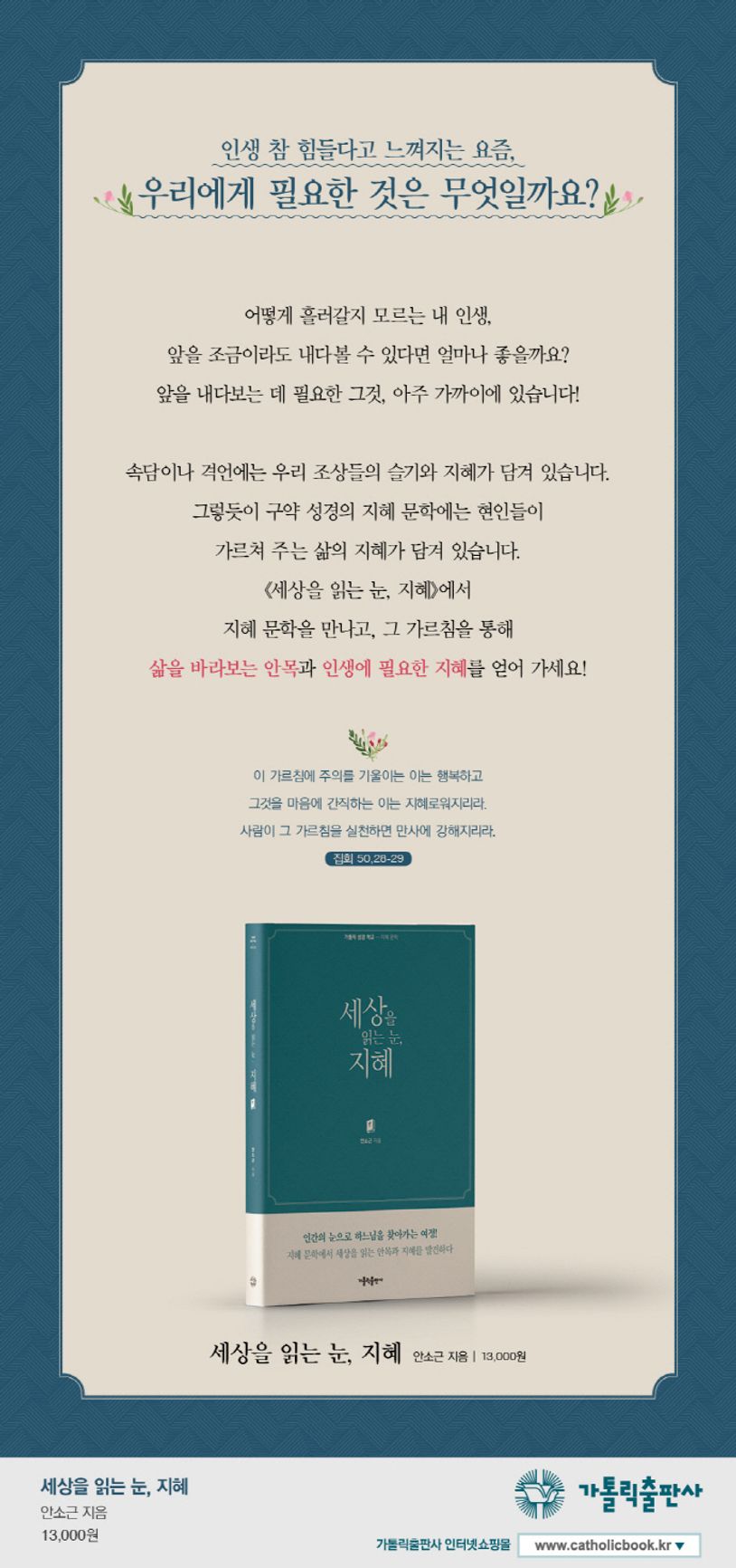 구약 성경의 다른 책들과 달리, 지혜 문학은 인간의 눈으로 하느님을 찾아가는 여정을 담고 있기에 우리 삶에 와닿는 이야기들이 많다. 성경은커녕 책 한 권도 차분히 읽기 쉽지 않은 혼잡한 시대에, 이 책과 지혜 문학을 함께 읽다 보면 인생을 살아가는 데 필요한 지혜를 얻고, 삶을 올바르게 바라보는 안목을 기르며, 궁극적으로는 하느님을 향해 나아가는 신앙인이 될 수 있을 것이다.