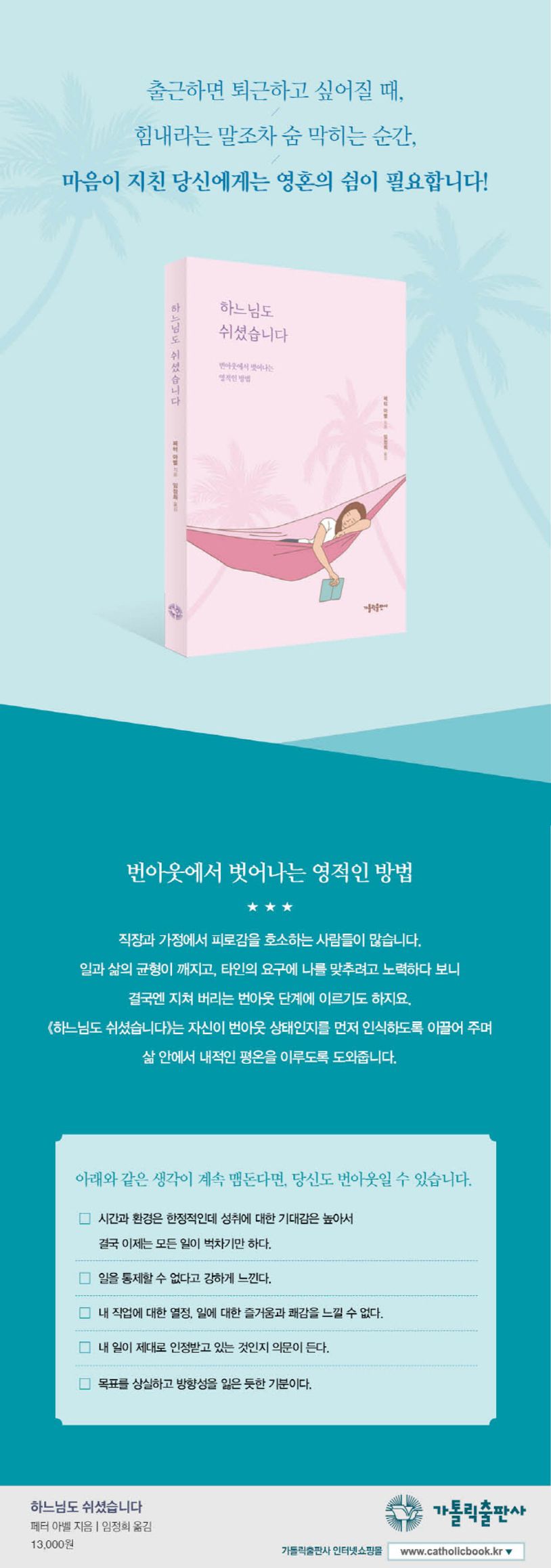 월요일 아침이 오는 것이 두렵고, 차곡차곡 쌓이는 업무에 답답하고, 직장 동료나 상사에게 화가 나고, 이것이 오늘날 많은 직장인들이 느끼는 현실이다. 이렇듯 직장인들은 온갖 피로에 시달리며 번아웃 증후군(탈진 증후군)을 겪는다. 이러한 번아웃은 스트레스를 일으킬 뿐만 아니라 신앙생활에까지 영향을 미치며 무기력함을 불러온다. 《하느님도 쉬셨습니다》는 그런 직장인들에게 편안한 쉼을 제공해 주는 휴식처와 같은 책이다. 이 책에서 저자는 독자들이 먼저 자신이 번아웃인지 아닌지 진단할 수 있도록 이끌어 준다. 그리고 여러 가지 예시와 쉬운 설명을 통해 내적인 평화를 얻고 삶 안에서 휴식과 여유를 가지며, 번아웃을 극복하는 방법을 다양하게 알려 준다. 이 책을 통해 오늘을 살아가는 직장인들이 일상생활 안에서 내면의 힘을 기르며, 번아웃을 성장의 기회로 삼을 수 있을 것이다.