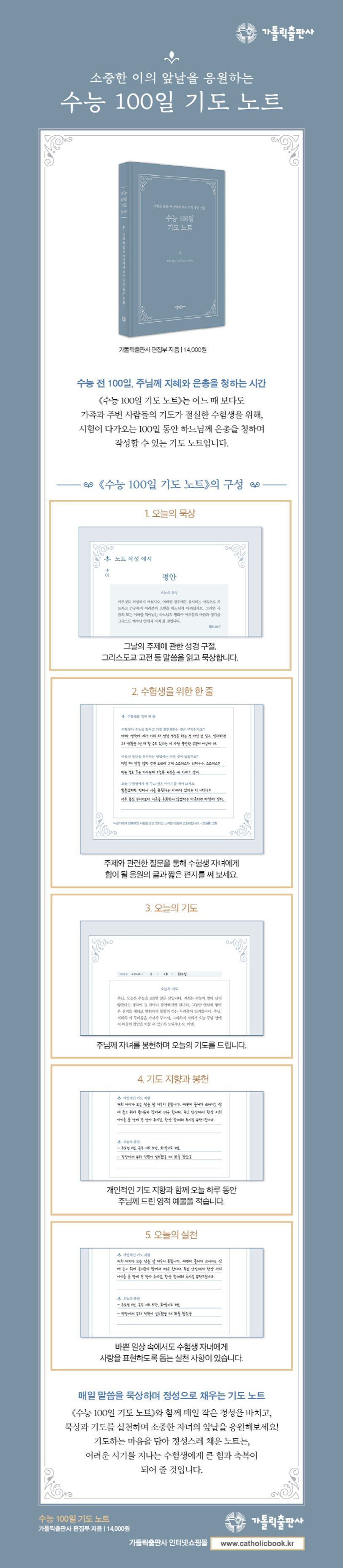 가톨릭출판사에서는 수험생 가족이 중요한 시기를 잘 보낼 수 있도록 《수능 100일 기도 노트》를 출간했다. 이 노트는 수능 시험이 다가오는 100일 동안 하느님께 은총을 청하며 매일 묵상하고 기도할 수 있도록 구성되었다. 또한 매일 수험생을 응원하는 짧은 편지를 작성할 수 있어 바쁜 삶 속에서도 수험생을 기억하도록 도움을 준다. 특별히 이전처럼 성당을 자유롭게 오가기 어려운 상황에서 홀로 기도하는 부모에게는 이 노트가 주님을 만나는 데 꼭 알맞은 도구가 될 것이다.