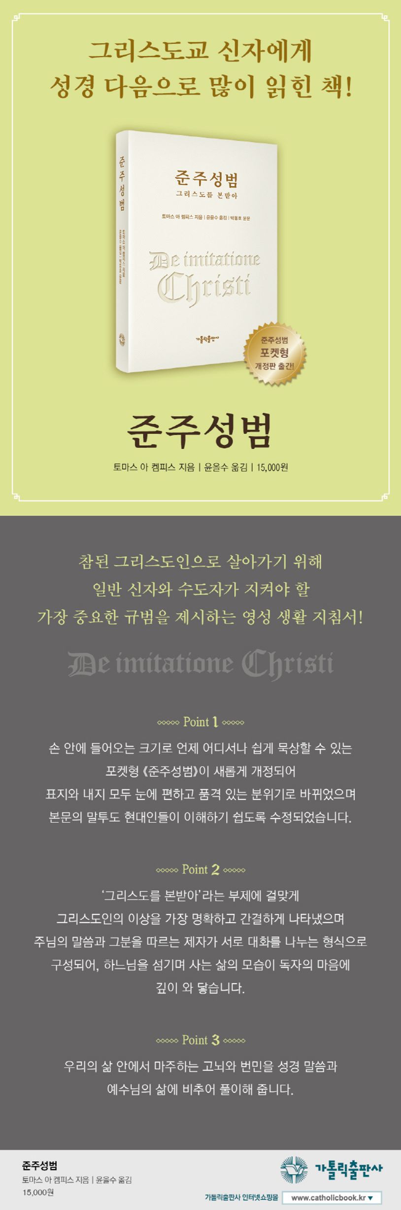 15세기 독일 수도자 토마스 아 켐피스가 쓴 《준주성범》은 출간된 이후 지금까지 그리스도교 신자뿐만 아니라 비신자들에게도 널리 읽혀 온 베스트셀러다. 이 책은 그동안 그리스도인의 이상을 가장 명확하고 간결하게 나타낸 영성 지도서라고 평가받아 왔다. 이 책은 총 4권의 큰 주제로 나뉘어 있으며, 각 권은 12~59장의 소주제들로 이루어져 있다. 이 소주제들은 ‘준주성범遵主聖範’이라는 제목처럼, 그리스도를 본받기 위해 일반 신자와 수도자가 지켜야 할 가장 중요한 규범들을 제시하는 방향으로 묶여 있다.