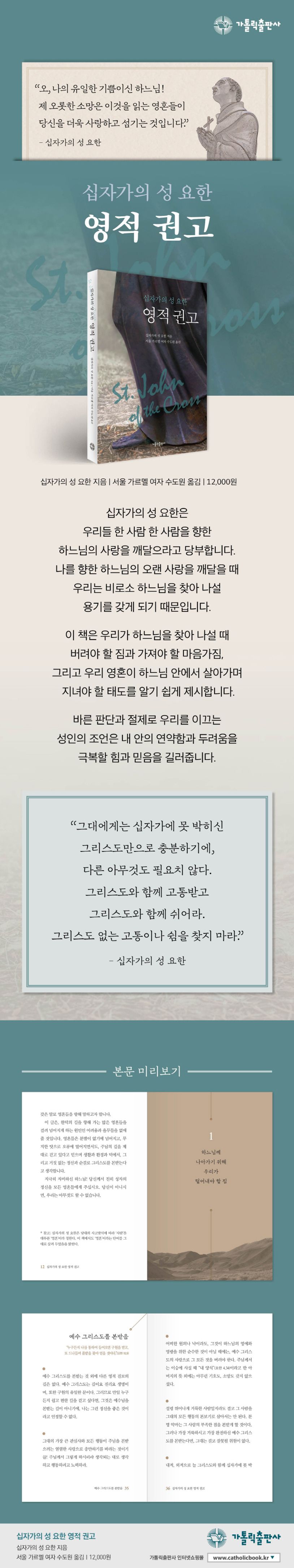 평생 하느님만을 향했던 이런 사람들 가운데 한 명이 바로 십자가의 성 요한이다. 예수의 성녀 데레사와 가르멜 수도회 개혁 운동을 이끌었고 고통과 박해 가운데서도 위대한 저술을 남겨 교회 박사로 선포되었다. 그는 특히 수덕적이고 신비적인 가르침을 많이 남긴 것으로 유명하다. 이러한 성인의 조언을 한데 묶은 금언집이 이번에 13년 만에 전면 개정되어 출간되었다. 《십자가의 성 요한 영적 권고》는 십자가의 성 요한의 영성을 담은 책으로, 성인의 모든 저서와 그가 개혁 가르멜 수도회의 수도자들을 지도하며 했던 말들, 그리고 자필로 남긴 권고들, 특히 여러 수도원을 방문하여 나눈 영적 대화 가운데 기록된 말들을 중심으로 엮은 것이다. 이 책에서 우리는 어디서부터 어떻게 해야 내 영혼이 하느님만을 바라볼 수 있을지에 대한 십자가의 성 요한의 엄격하지만 때로는 진솔하고 따뜻한 조언과 만날 수 있다.
