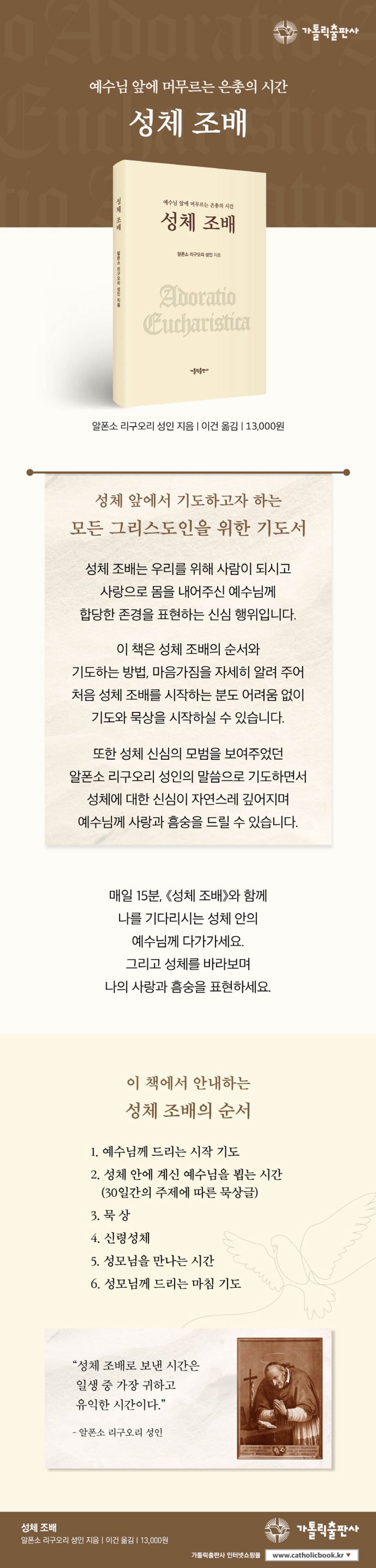 성체안에계신예수님과만나는시간,성체조배누구나한번쯤예수님이내옆에계셨으면좋겠다고간절히바란적이있을것이다.특히요즘처럼어려운시기일수록그분께내마음을털어놓고위로받고자하는마음이커진다.이럴때성체조배가큰힘이되어준다.성체조배는예수님을내마음에모시고그분과끊임없는대화를나누도록이끌어주기때문이다.이에성체조배를통하여하느님과의참된만남으로이끌어주는책,《성체조배》가새롭게개정되어출간되었다.이번개정판은문장을현대적인감각으로다듬었으며,알폰소리구오리성인의성체신심을보다잘느낄수있도록편집하였다.또한언제어디서나들고다니며기도할수있도록튼튼하고도산뜻한느낌으로새롭게디자인하였다.이책은알폰소리구오리성인이제시한기도순서에따라한달간묵상을시작할수있도록이끌어준다.주님의말씀을깊이묵상하며실생활에서실천할수있도록도와주는것이다.그리하여부제인‘예수님앞에머무르는은총의시간’처럼,성체안의예수님과진정으로만날수있도록해준다.예수님은저희를사랑하시기위하여이세상에서죽으신것만으로만족하지않으시고,죽으신후에도거룩한성체성사안에서저희와함께머무시기를원하십니다.그리하여사람들을오롯이당신의기쁨으로삼으셨습니다.-본문중에서주님곁에머물러내삶을온전히내어드리세요우리에게는하느님을가까이만날수있는여러가지방법이있다.그가운데성체조배는성체를통해주님의현존을체험하기좋은방법이다.하지만성체조배를처음시작한신자들은성체조배란무엇인지,이를어떻게시작해야하는지막막해하곤한다.그래서이책은머리말에서신자들에게성체신심과성체조배란무엇인지,성체조배를어떻게하면좋을지에대해서상세하게알려준다.또한이책은매일‘예수님께드리는시작기도’,‘성체안에계신예수님을뵙는시간’,‘묵상’,‘신령성체’,‘성모님을만나는시간’,‘성모님께드리는마침기도’순서로묵상과기도를할수있도록구성되어있다.‘예수님께드리는시작기도’는예수님께우리마음을열어보여드리며그분현존을온전히받아들일수있도록이끌어주고,‘성체안의계신예수님을뵙는시간’과‘성모님을만나는시간’은그날의기도내용에따라묵상할수있도록도와준다.그리고‘신령성체’의기도를바치며실제적으로성체를영할수는없지만천상양식인성체를그리는간절한열망을주님께바칠수있도록한다.그리고‘성모님께드리는마침기도’를바치며성모님께우리의전구를드리며묵상을마무리하도록해준다.성체조배를처음시작하는사람은훈련이되어있지않기에온전히집중하며침묵중에온전히머무르기어려울것이다.하지만이책을활용한다면매일순서를따라가며기도할수있다.또한성체조배를자주해오던사람이라도이책을활용한다면성인의말씀과묵상을통해예수님의현존을깊이묵상할수있게될것이다.그래서그날의묵상에따라침묵속에서예수님을뵙고대화를나누게된다면한층더성숙한신앙생활을할수있을것이다.신앙생활의자양분이되는성체조배바로오늘부터시작해보세요!이책의저자인알폰소리구오리성인은“성체조배로보낸시간은일생중가장귀하고유익한시간이며,15분간의성체조배로얻은것은하루동안다른여러가지신심행위로거둔것보다클것”이라고말했다.그만큼예수님의몸인성체앞에머물러기도하는그행위가중요하고값지다는것이다.이처럼성체앞에머물러주님수난과사랑을묵상한다면우리곁에계시는예수님의현존과성체성사의신비를더깊이깨달을수있게된다.그래서요한바오로2세성인교황을비롯한여러교황들도성체조배의중요성을여러차례강조하였다.이처럼성체조배는우리삶과신앙생활에있어값진자양분과버팀목이되어준다.그러므로이책과함께그리스도께잠시곁을내어드리며그분을내마음에모시도록노력해보자.그러면우리를향한그분의사랑을알게될것이며,성체조배가주님께서마련해주신은총의시간임을깨닫게될것이다.