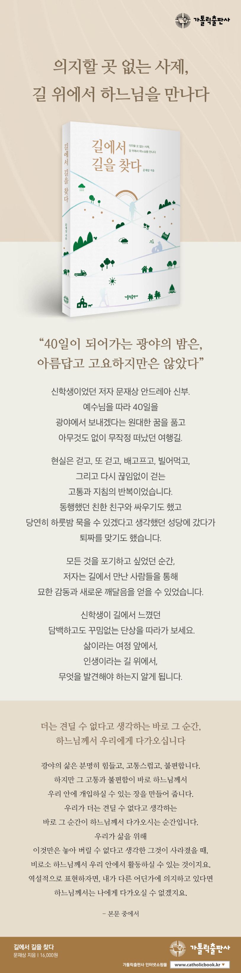 《길에서 길을 찾다》는 지금은 사제가 된 저자가 신학생 시절 떠났던 40일 동안의 무전여행을 기록한 여행 에세이집이다. 저자는 예수님의 광야 체험을 직접 겪어 보고자 무일푼으로 다니며, 히치하이크를 통해 이동하고, 노숙하고 걸식했다. 그렇게 하느님께, 그리고 사람들의 인정과 베풂에 자신을 내맡겼던 저자는 전국 여행을 마치면서 ‘아직 세상은 살 만하다’는 결론을 내린다. 일상에서 벗어나 빈손으로 훌훌 떠나고 싶지만 그럴 수 없는 이들에게 이 책은 단순한 여행의 재미를 넘어 새로운 위로와 용기를 건넨다.