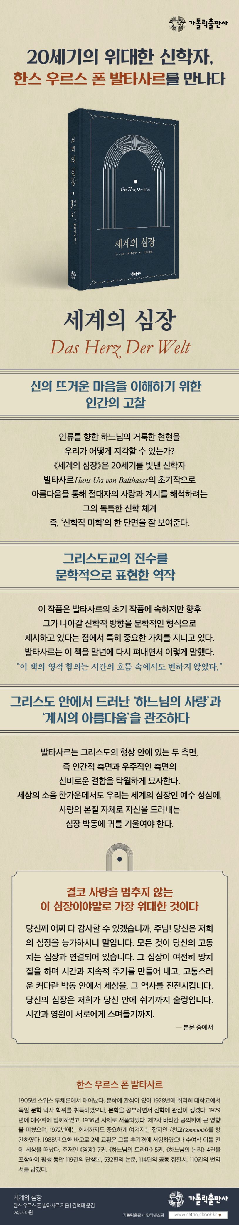 한스 우르스 폰 발타사르는 20세기 가장 독창적인 가톨릭 신학자로 오늘날 가톨릭만이 아니라 개신교에도 지대한 영향을 미치고 있는 신학자이다. 그러한 그가 세상을 뜨기 직전에 재출간하려고 했던 책이 있다. 그는 재출간할 때에야 초판에는 쓰지 않았던 머리말을 쓰며 “이 책의 영적 함의는 시간의 흐름 속에서도 변하지 않았다.”고 단언했다. 이 책이 바로 《세계의 심장》이다.