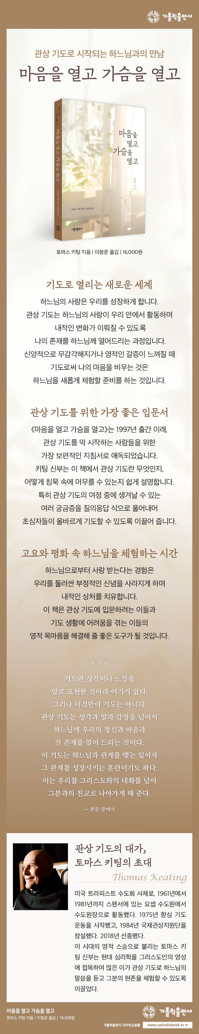 이 책은 1997년도에 발행된 이후 현재까지 꾸준히 사랑받아 왔으며 수많은 사람을 하느님과 만나 쉬는 길로 인도해 왔다. 이번에 가톨릭출판사에서는 향심기도를 처음 접하는 이들의 이해를 돕기 위해 이 책을 새로운 역자의 번역으로 전면 개정하여 선보인다. 책의 내용을 다듬고 각 꼭지의 제목을 수정했으며, 깔끔한 디자인 구성을 더해 시각적 편안함을 극대화했다. 《마음을 열고 가슴을 열고》를 읽으며 하느님과 더 깊은 믿음의 관계를 맺는 데 유용한 가르침과 지침들을 알아보자. 우리가 영적 여정을 시작하는 과정에서 중요한 지표가 되어 줄 것이다.