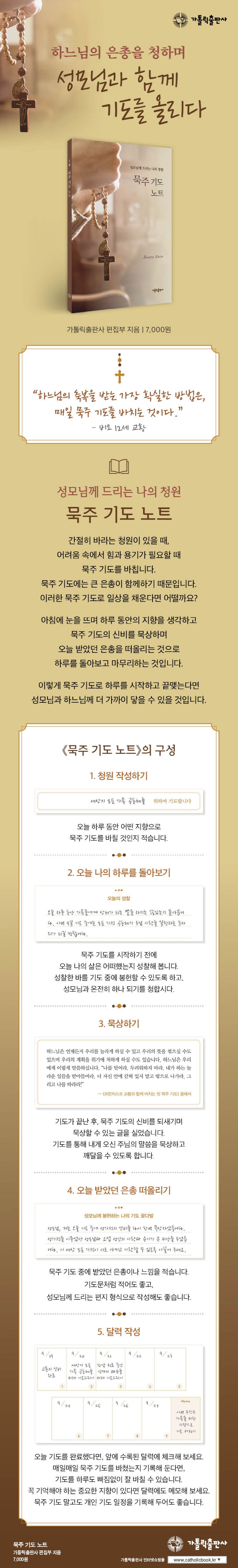 묵주의9일기도를더욱풍성하게해줍니다!묵주기도는신자들의삶과함께하는기도다.그래서무언가특별한은총을청하고자할때도다른기도를바치기보다묵주의9일기도를바치곤한다.나의바람이나어려운일을주님께서돌보아주실거라는믿음이있기때문이다.하지만꾸준히기도를드리는일이쉽지만은않다.기도하는습관이들기전까지는따로시간을내어기도드리는것자체가어렵게느껴지기때문이다.또기도하려고마음은먹었지만,기도문을따라읽는것만으로는무언가부족한것처럼느껴지기도한다.이러한신자들에게묵주기도의은총을마음속깊이느낄수있도록도움을주는노트가출간되었다.바로《묵주기도노트》다.《묵주기도노트》는성모님께나의청원과감사하는마음을담아고백하도록이끌어준다.또한날마다다양한청원을바치며기도할수있도록돕기때문에묵주기도를더욱풍성하게만들어준다.나날이커지는묵주기도의은총매일매일작성하는나만의묵주기도노트《묵주기도노트》는이노트만있다면누구나묵주기도를바칠수있도록구성하였다.묵주기도를드리는법,9일기도를바치는순서,주요기도문,신비의순서등가장기본적인내용을빠짐없이실었다.그리고본문중간마다베스트셀러《마리아의비밀》의일부를발췌하여,믿음의모범이신성모님의삶을함께묵상할수있다.매일매일나의청원과감사를적을수있을뿐만아니라,어떤기도를했는지적을수있는체크리스트도마련하여빠짐없이9일기도를바칠수있다.그래서기도를바치는보석같은마음을잃지않도록해준다.이노트는이러한방식으로빠짐없이기도를드릴수있도록이끌어준다.단순히기도를청하는데에서그치지않고매일내삶을성찰하며이를봉헌하도록하여서,우리일상을기도의은총으로채우도록이끈다.무엇보다기도중에주님께서내게어떠한말씀을하시는지듣도록권한다.이노트를작성하며묵주기도를드리다보면내뜻과주님의뜻이점점더가까워지고,그분께한발짝더나아갈수있게된다.이렇게주님의뜻을찾으며나자신과삶을돌아보게되면기도를드리는시간이내게영적인힘을주는시간이되고,참된그리스도인으로사는데꼭필요한시간이될것이다.나만의기도꽃다발을봉헌하며성모님이가셨던신앙의길을걷다《묵주기도노트》는72일간작성하도록구성되어있다.일반적으로묵주의9일기도는9일씩세번54일간바치거나네가지신비를아홉번씩하여72일기도를바친다.이를고려하여각자54일,72일이라는기간을택해충실히묵주기도를드릴수있도록구성되어있다.9일의묵주기도는오랜시간동안기도를드리다보니바쁜일상에쫓겨끝까지바치지못하는경우도있다.이럴때자신에게실망하고기도를포기하기도하지만,이노트를활용하면언제라도다시묵주기도를바칠수있다.그동안기도를드렸던지난과정과마음이차곡차곡기록되어있기때문이다.이처럼이노트는우리가9일기도를통해신앙의모범이신성모님을닮아참된그리스도인으로거듭날수있도록인도한다.간절히기도하는마음으로노트를채우다보면어느덧나만의기도꽃다발이완성될것이다.특별히청하고자하는지향이있다거나,삶의어려운순간을지나고있다면묵주를들고9일기도를시작해보자.로사리오의성모님께서는우리마음에희망의등불을켜주시어언제나함께해주실것이다.