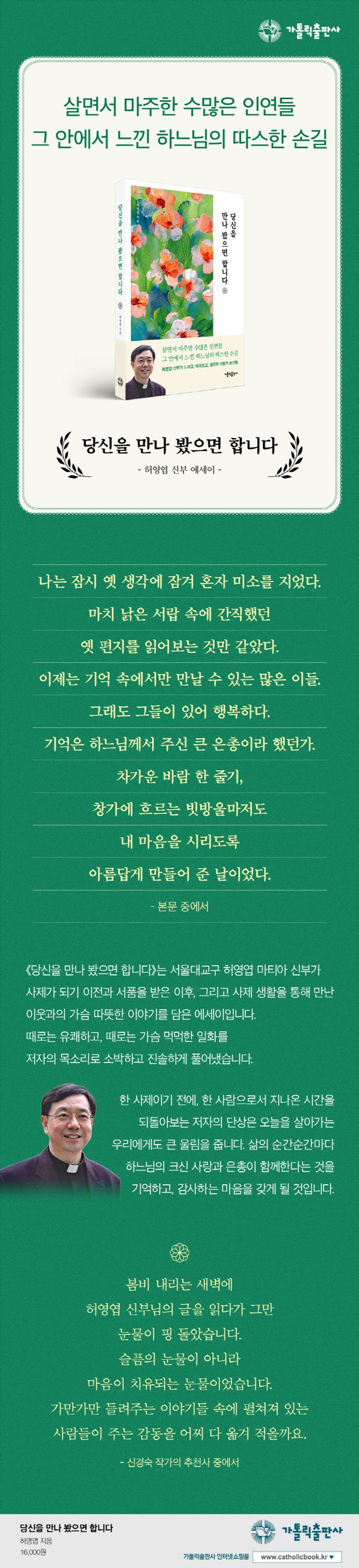 그런 우리에게 스치듯 지나가는 만남 안에도 하느님의 은총이 깃들어 있음을 일깨우는 책, 《당신을 만나 봤으면 합니다》가 출간되었다. 이 책은 과거에 출간되었던 《신부님, 손수건 한 장 주실래요?》을 개정한 책이지만 저자가 그동안 만난 사람들에 대한 이야기와 가슴 따뜻한 이야기들을 추가하였으며, 원래의 글도 내용을 보태고 추가하여 완전히 새롭게 태어난 책이다. 또한 책의 디자인도 저자의 감수성을 살려 산뜻하게 꾸며, 이전에 이 책을 접했던 사람들도 새로운 책처럼 읽을 수 있다. 영적으로 더욱 깊어진 이야기로 가득 채워진 이번 책은 평소에 허영엽 신부의 글을 좋아했던 이들이나 가톨릭 사제의 삶이 궁금한 이들, 또 일상에서 소소한 기쁨을 찾고자 하는 이들 역시 흥미롭게 읽을 수 있을 것이다.