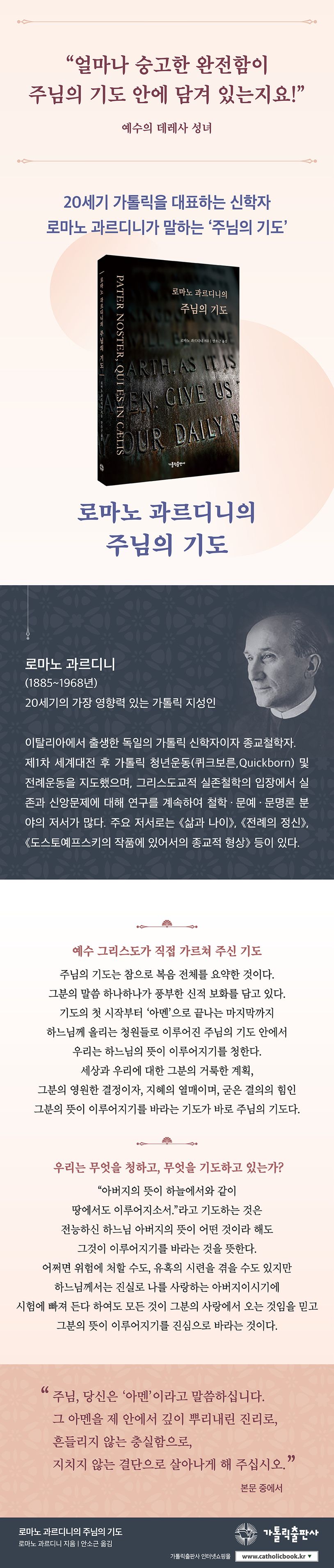 20세기 대표적인 가톨릭 신학자 가운데 한 사람으로 널리 알려진 로마노 과르디니가 주님의 기도에 관해 해설한 책이다. 그의 대표작 중 하나이기도 한 이 책에서는 주님의 기도의 의미를 잘 이해하지 못한 채 기도를 바쳤던 이들에게 이 기도에 담긴 지혜를 한 구절씩 해석하며 알려 준다. 신학자가 쓴 책이지만 그리스도인 누구나 쉽게 읽을 수 있도록 풀어 나간 이 책을 통해 주님의 기도에 담긴 진수를 깨닫고, 주님의 기도를 정성껏 바치며 내 삶을 주님께 더 가까이 가져갈 수 있을 것이다.
