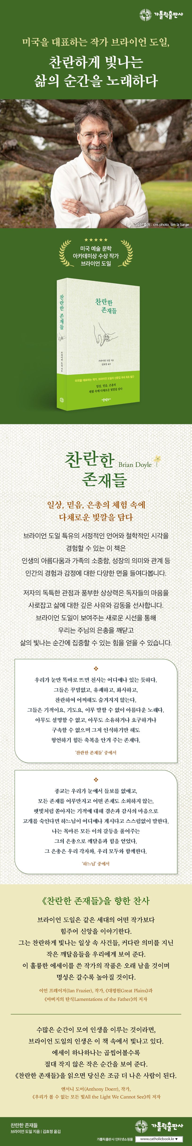 이 책은 브라이언 도일이 잡지를 포함한 여러 매체에 소개했던 글들을 모으고 다듬어 만들었다. 저자는 일상에서 발견하게 되는 친절과 기쁨, 사랑과 은총을 만날 때마다 주의 깊게 들여다본 순간들을 경쾌하고 재치 있는 문장으로 풀어낸다. 그러나 그 작은 순간들이 주는 울림은 결코 작거나 가볍지 않다. 브라이언 도일만의 독특하고도 예리한 통찰력으로 신앙, 가족, 삶의 의미 등 지금 이 시대에 꼭 돌아봐야 할 중요한 모든 것에 대해 나눈 이야기 속으로 여러분을 초대한다. 그 이야기 끝에서 사랑의 빛을 가득 머금은 존재들이 우리 곁에 무수히 많았다는 사실을 깨닫게 될 것이다.