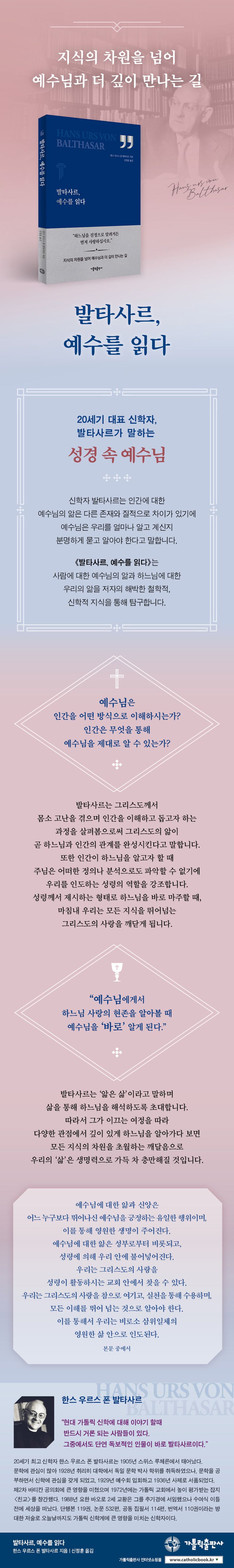 우리는 예수님을 잘 알고 있는가? 우리에게 예수님은 어떤 분이신가? 예비 신자나 세례를 받은 지 얼마 안 된 새신자는 물론, 오랫동안 신앙생활을 열심히 해 온 사람에게도 예수님은 알 듯 모를 듯한 분이시다. 이런 예수님에 대해 20세기를 대표하는 신학자 한스 우르스 폰 발타사르가 이야기한다. 《발타사르, 예수를 읽다》에서 발타사르는 예수님이 어떻게 인간을 아시며, 인간은 예수님을 어떻게 아는지 알려 준다. 특히 신자들에게 친숙한 성경의 여러 구절을 살펴보며 예수님이 어떤 분이신지 이해하고 그분과 더 깊이 친교를 이룰 수 있도록 이끌어 준다.