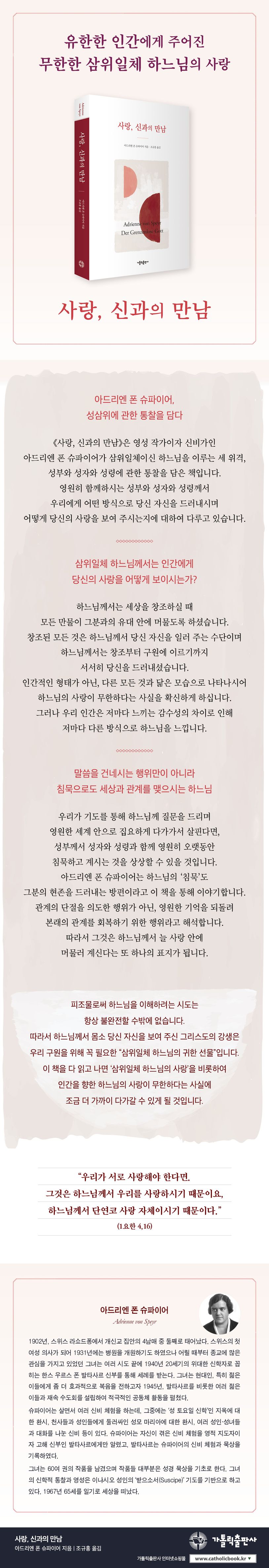 아드리엔 폰 슈파이어는 스위스의 의사이자 현대의 신비가로, 신학과 영성, 신비와 성흔에 관해 60여 권이 넘는 책을 저술하였고, 그 책들이 전 세계적으로 번역되어 지금까지 많은 사랑을 받고 있다. 그녀는 특히 20세기 위대한 신학자인 발타사르와 영적으로 교류를 하며 많은 영감을 주었기에 사람들에게 널리 알려졌다. 슈파이어의 영성과 신비 체험은 발타사르가 신학을 이해하는 데 직접적으로 영향을 미쳤다. 그래서 발타사르는 슈파이어의 책을 직접 출판하고, 교황청에서 심포지엄을 진행하기도 하며 그녀의 영성을 알리려고 많은 노력을 했다. 이러한 슈파이어의 기도를 바탕으로 한 영성이 고스란히 담겨 있는 《기도의 세계》는 이미 출간되었으며, 그에 이어 슈파이어 시리즈 두 번째 책인 《사랑, 신과의 만남》이 출간되었다.