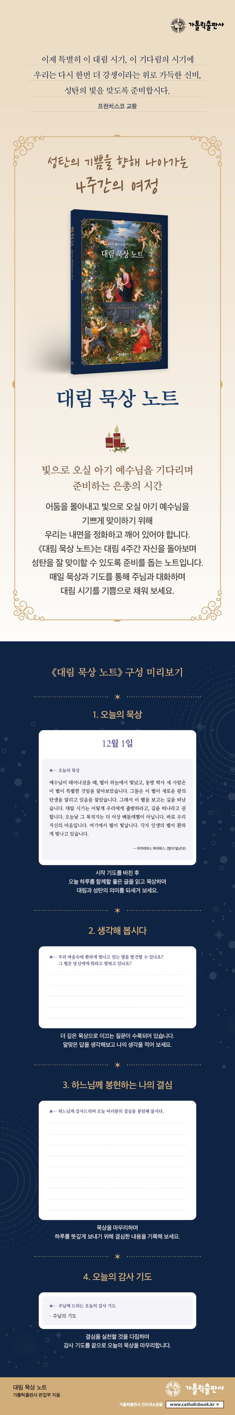 이에 대림 시기의 본질과 의미를 되새겨 보며 하루하루 더 깊은 묵상으로 이끌어 주는 《대림 묵상 노트》가 출간되었다. 《대림 묵상 노트》는 매일매일 잠깐의 시간을 내어 짧은 구절을 읽고 자신을 돌아볼 수 있도록 해 주는 노트로, 아기 예수님을 더욱 기쁘게 맞기 위해 대림 시기 동안 자신의 시간을 조금씩 봉헌하도록 이끌어 준다.