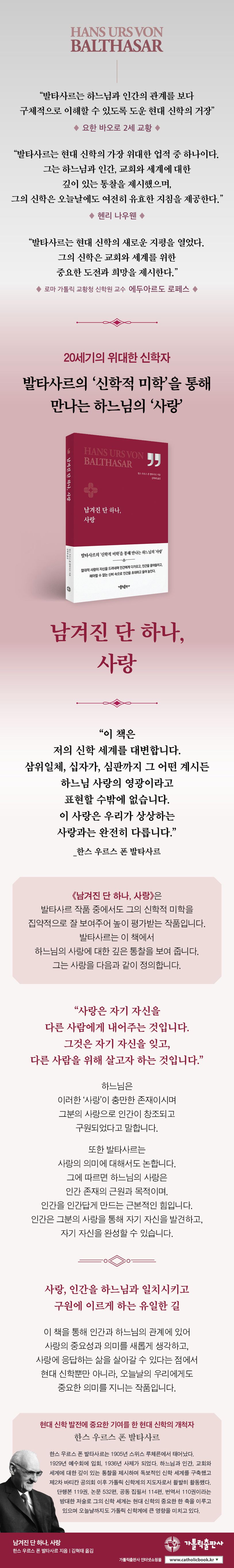 위대한 신학자라고 불리는 발타사르의 신학이 무엇인지 알고 싶은 이들에게 딱 맞는 책이 있다. 《발타사르, 예수를 읽다》에 이어 출간된 발타사르 신학 시리즈의 《남겨진 단 하나, 사랑》이다. 아름다움을 통해 해석하는 계시와 그의 특기를 살려 문학적으로 풀어내는 신학은 무엇인지 알 수 있을 것이다.