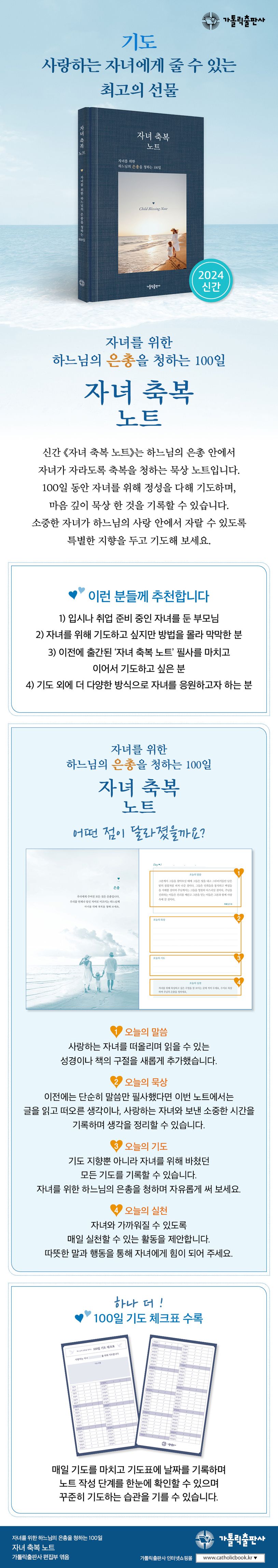 이처럼 기도가 낯선 이들에게 도움을 주는 《자녀 축복 노트- 자녀를 위한 하느님의 은총을 청하는 100일》이 출간되었다. 2020년 처음 선보였던 《자녀 축복 노트》에 관한 독자들의 긍정적인 반응을 바탕으로, 사랑하는 자녀를 떠올리며 매일 꾸준히 기도하는 습관을 만들어 가는 데 도움을 주기 위해 새로운 모습으로 재탄생했다. ‘하느님의 은총’이라는 주제 아래 풍성하고 다채로운 묵상 글을 엮었을 뿐 아니라, 세련되고 진중한 분위기의 노트 디자인은 하루의 시작과 끝에 차분히 마음을 가라앉히고 노트를 작성하도록 이끌어 준다. 특히 튼튼하고 견고한 제본 방식을 적용해 언제든 편하게 노트 작성에 임할 수 있을 뿐 아니라 오래도록 간직할 수 있는 특징이 돋보인다.