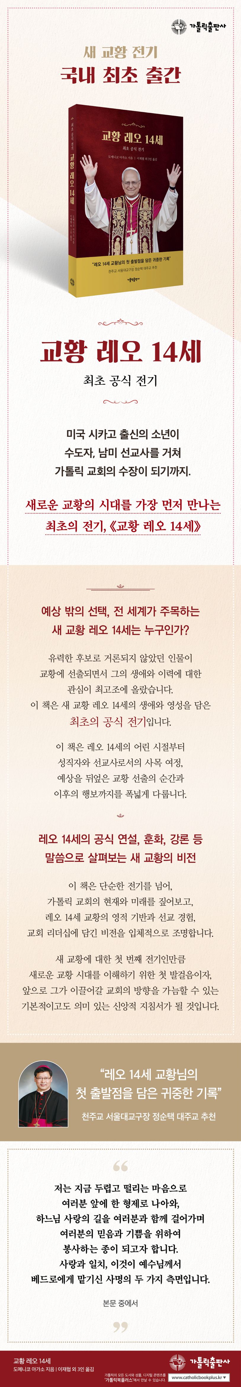 “이 책은 교황님의 그 첫 출발점을 담은 귀중한 기록입니다. 지난 콘클라베의 분위기와 과거 교황님의 사목 여정, 특히 미국 태생으로 페루에서 오랜 시간 동안 선교사로 살아오신 그분의 삶은 앞으로 걸어가실 행보에 대한 기대를 품게 합니다.”