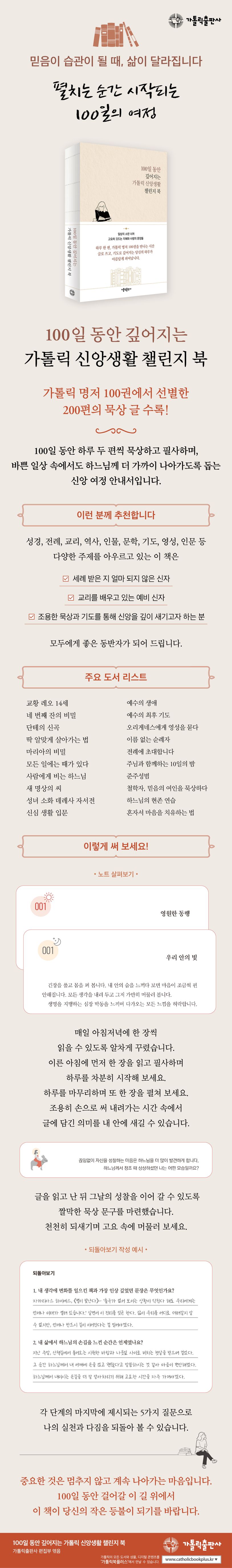 매일 읽고 쓰는 습관을 통해 신앙을 키우는 100일 여정을 담은 필사 노트다. 140여 년의 역사를 지닌 가톨릭출판사 출간 도서 100권에서 두 편씩 엄선한 200편의 글은 성경·전례·교리·역사·인물·문학·기도·영성·인문 등 다양한 주제를 아우르고 있다.