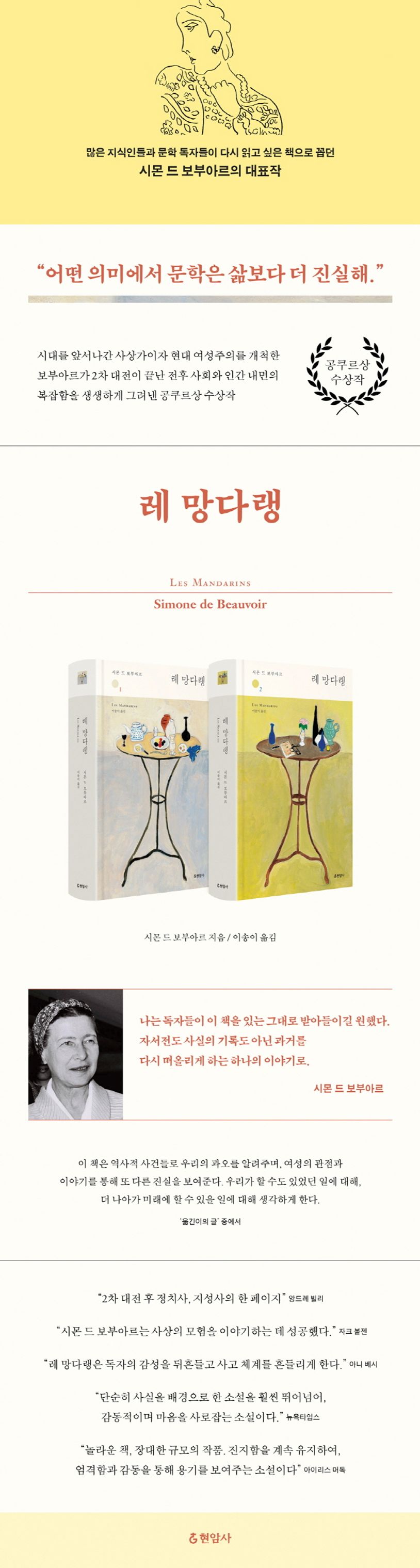 그중 『레 망다랭』은 보부아르의 대표작으로 철학자인 보부아르에게 세계 3대 문학상 중 하나이자 프랑스 최고 문학상인 공쿠르상을 안겨준 작품이다. 제2차 대전 직후 파리를 무대로 카뮈, 사르트르 등 당시 활동했던 지식인들을 생생하게 그려낸 듯한 이 사실적인 작품은 출간 당시에도 큰 화제를 모았으며 지금까지도 전 세계적으로 읽히고 있다.