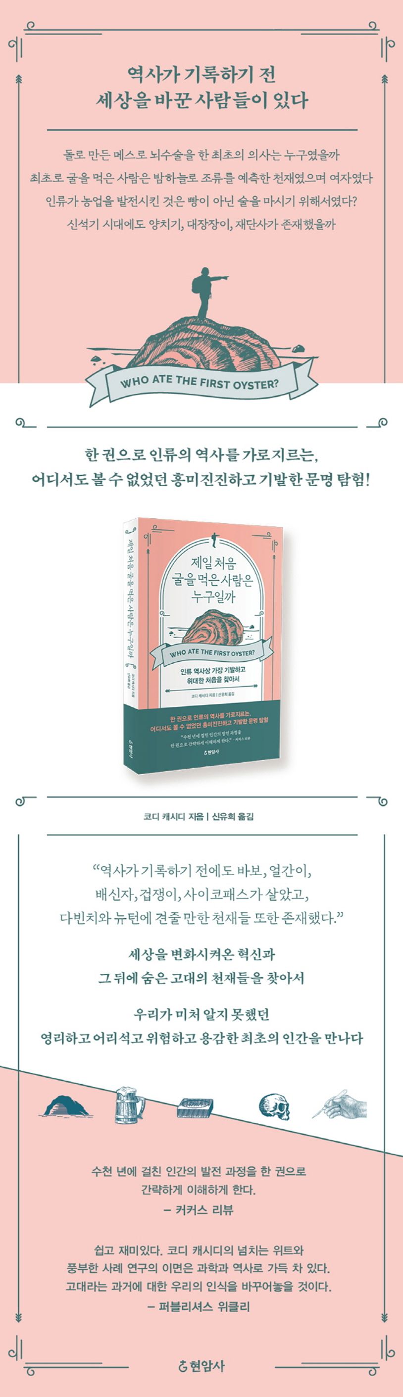 〈제일 처음 굴을 먹은 사람은 누구일까〉는 누구도 깊이 생각해보지 않았으나 지금 우리의 삶을 바꾼 것들의 시작을 찾아 떠난다. 저자인 코디 캐시디는 역사가 기록하기 전 세상을 바꾼 사람들을 만나기 위해 아주 오래전 그 당시를 파헤친 많은 연구를 프로파일링하며 그 시기를 드나든다.