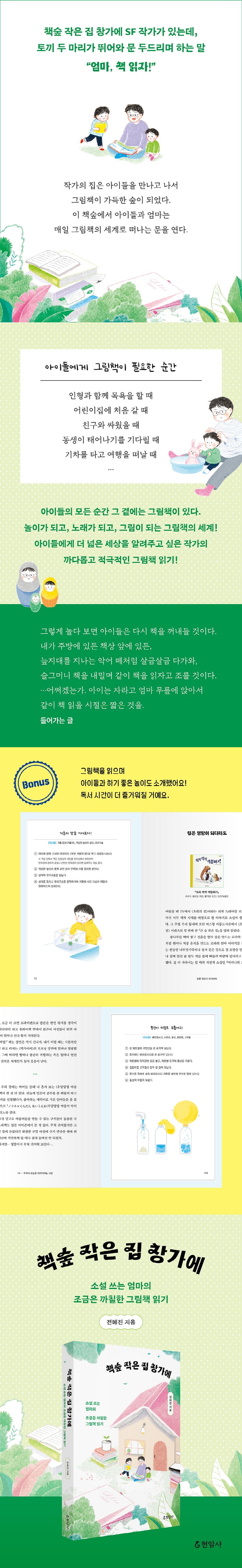 『책숲 작은 집 창가에』는 어린 시절 그림책을 사랑했지만 자연스레 멀어졌던 작가가 아이들을 키우면서 다시금 그림책의 세계에 발을 담그고 그 세계를 탐험한 기록이다. 저자는 아이들에게 어떤 책을 어떻게 읽어줄지 치열하게 고민하고, 좀 더 즐거운 독서 시간을 만들어주기 위해 다양한 시도를 한다. 책에 나온 장소를 아이와 함께 찾아가보고, 구연산과 베이킹 소다로 폭발놀이를 하고, 그림책 주인공들을 그려 여기저기 전시해놓는다. 그렇게 수많은 그림책을 온몸으로 읽으면서 아이들은 책과 함께 커가고 엄마 또한 같이 성장해간다. 이 책은 한 양육자의 독서 에세이인 동시에, 그림책을 아이들과 어떻게 읽어야 할지 고민하는 이들에게 도움을 주는 독서 가이드이다.