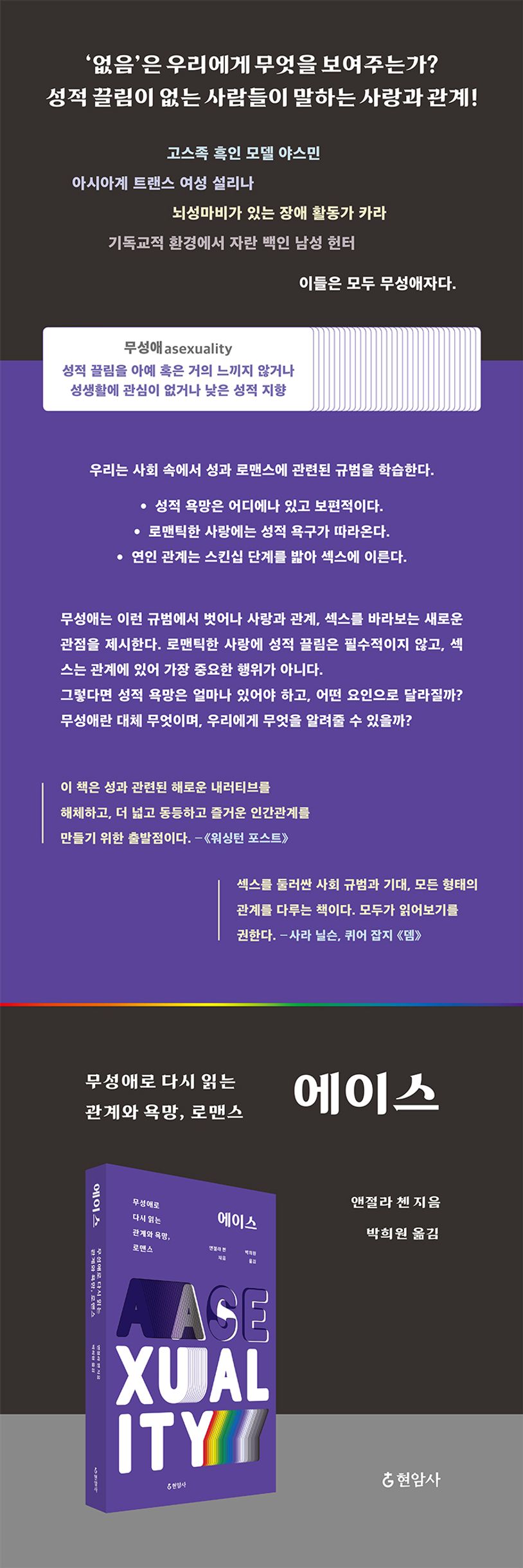 앤절라 첸은 다양한 무성애자들을 만나 그들의 이야기를 들었다. 섹스에 완벽한 거부감을 느끼는 루시드, 기독교 사회에서 성장한 백인 남성인 헌터, 아시아인이자 트랜스 여성인 설리나, 장애를 지니고 있는 카라 등 모두 다른 삶을 살아온 만큼이나 무성애자들의 세계 또한 제각각이다. 무성애의 여러 세계를 들여다본다면 사랑과 섹스를 새로운 눈으로 보게 될 것이다.