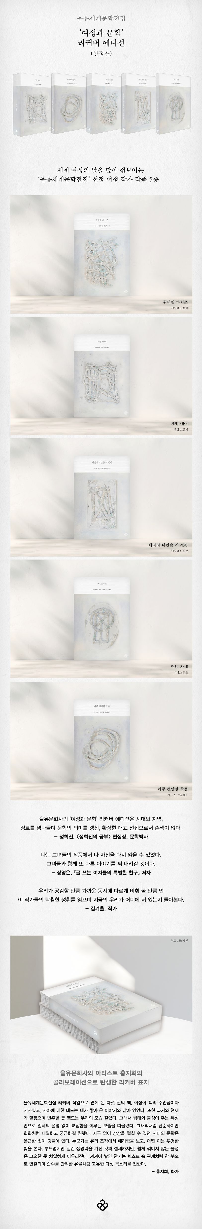 2024년 세계 여성의 날(3/8)을 맞아 ‘을유세계문학전집’에서 선정한 여성 작가의 작품 5종을 리커버 에디션으로 선보인다. 브론테 자매의 소설, 에밀리 디킨슨의 시 선집, 시몬 드 보부아르의 자전적 소설, 이디스 워튼의 중단편 소설까지, 자신의 정체성을 찾으려 애쓰며 한 인간으로 오롯이 서기 위해 분투하는 모습과 그 과정에서 드러나는 내적 갈등이 탁월하게 묘사된 작품들이다. 본 세계문학전집이 지향해 온 ‘작가를 연구한 전문가의 원전에 충실한 번역’은 이번 ‘여성과 문학’ 리커버 에디션에서도 빛을 발하고, 아티스트 홍지희가 각 문학 작품에서 받은 영감을 형상화한 표지 이미지는 본 에디션에 특별한 색을 부여한다.
