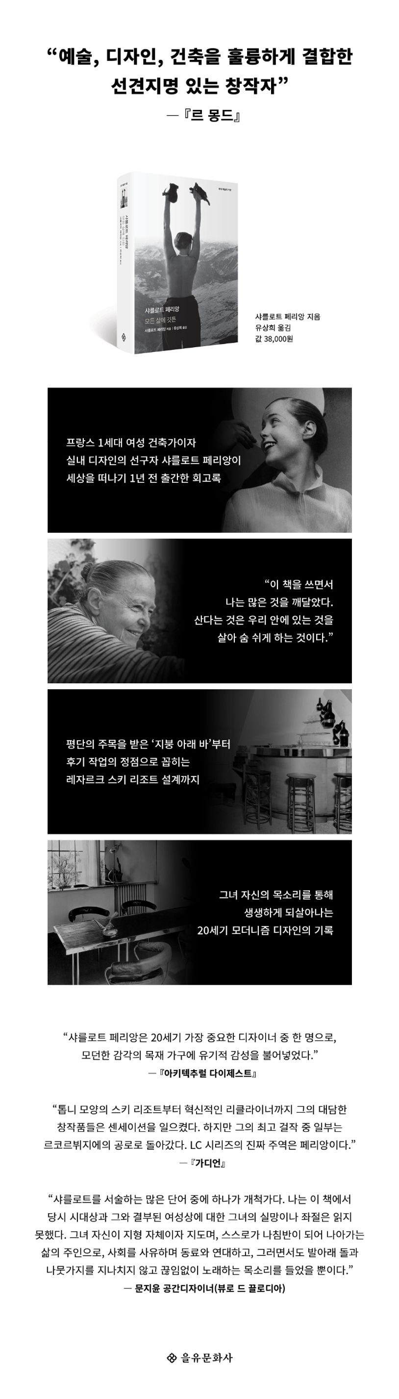 이 책은 샤를로트 페리앙이 세상을 떠나기 1년 전 자신의 모험적 삶을 풍성한 시각 자료와 함께 진솔하게 그려 낸 자서전으로, 자유롭고 독립적이며 창조적인 삶을 살다 간 한 예술가의 여정이 고스란히 담겨 있다.