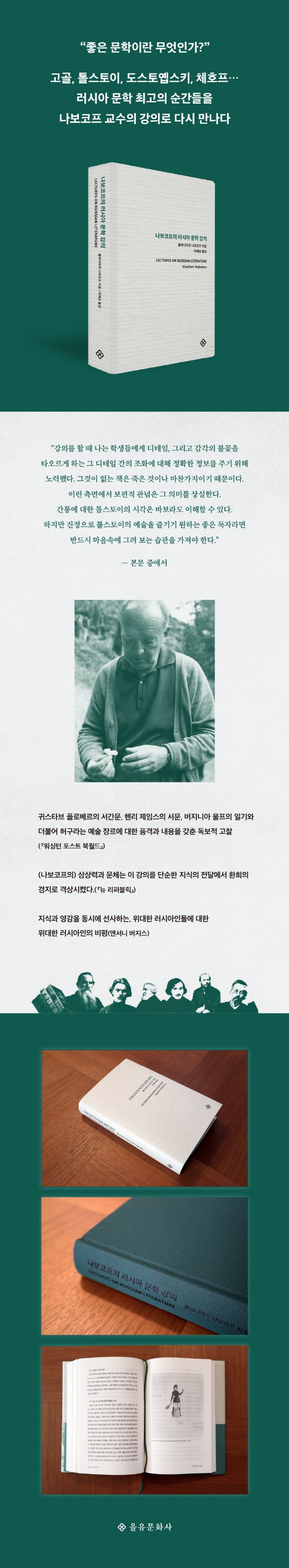 20세기 중반에 막 미국으로 건너온 나보코프가 미국의 여러 대학에서 러시아 문학을 주제로 진행한 강의를 모은 이 책에는 바로 그 최고의 재능이 담겨 있다. 뛰어난 문학이란 무엇인가 혹은 무엇이어야 하는가, 또 그 기준에 부합하는 뛰어난 작품은 어떻게 만들어졌는가. 나보코프는 이 주제로 자유롭게 강의를 펼쳐 가고, 독자는 그를 따라가며 ‘교양 문학’의 핵심이자 나보코프가 지닌 천재성의 원천인 ‘문학성’에 대한 고찰에 빠져들게 된다.