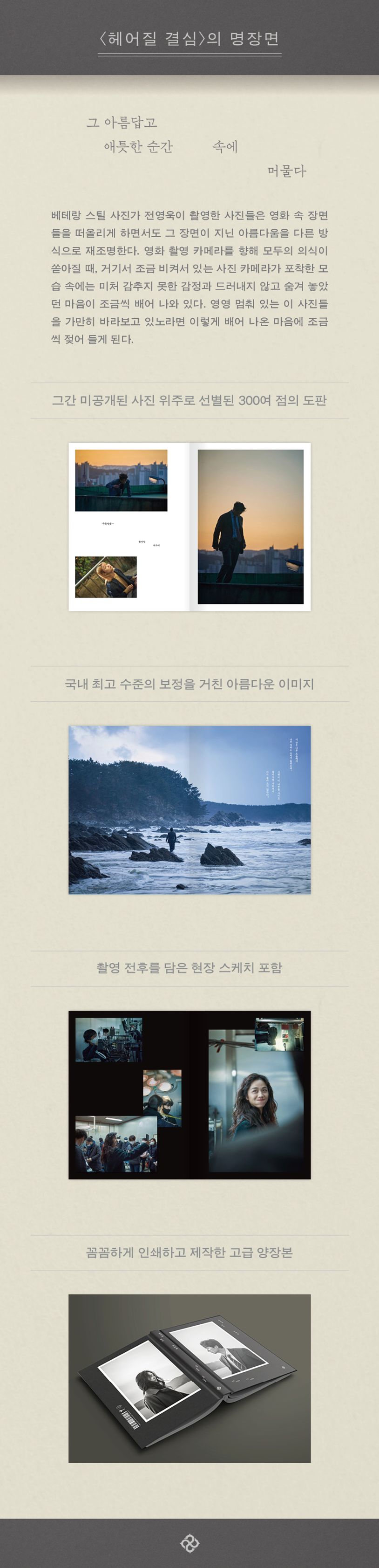 『헤어질 결심 포토북』에는 영화 속 순간들을 다른 각도에서 포착한 사진들이 담겨 있다. 베테랑 스틸 사진가 전영욱이 촬영한 이 사진들은 영화 속 장면들을 떠올리게 하면서도 그 장면이 지닌 아름다움을 다른 방식으로 재조명한다. 영화 촬영 카메라를 향해 모두의 의식이 쏟아질 때, 거기서 조금 비켜서 있는 사진 카메라가 포착한 모습 속에는 미처 감추지 못한 감정과 드러내지 않고 숨겨 놓았던 마음이 조금씩 배어 나와 있다. 영영 멈춰 있는 이 사진들을 가만히 바라보고 있노라면 이렇게 배어 나온 마음에 조금씩 젖어 들게 된다.