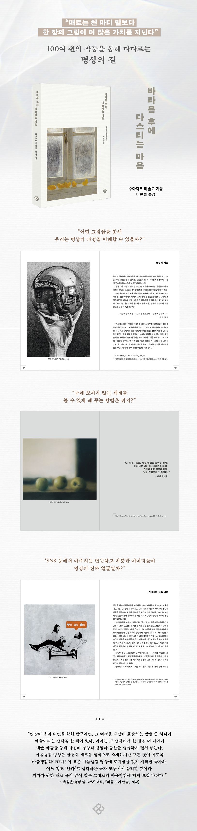 이 책은 명상 책이다. 동시에 그림책이기도 하다. 그림을 통해 명상의 방법을 알려주는 친절한 안내서이자, 그림 자체를 바라보는 것만으로 마음챙김의 효과를 선물해 주는 책이기도 하다. 저자 수아지크 미슐로는 대학에서 미술사와 문학 및 영화를 공부하다가 처음 경험한 명상에 푹 빠져 그 길로 명상가의 삶을 살고 있다. 이 책에서 저자는 자신이 하나둘 수집하며 마음과 명상의 세계를 알게 해 준 이미지들을 기꺼이 독자와 나누려 한다. “어떤 그림들을 통해 우리는 명상의 과정을 이해할 수 있을까?” “눈에 보이지 않는 세계를 볼 수 있게 해 주는 방법은 뭐지?” “SNS 등에서 마주치는 번듯하고 차분한 이미지들이 명상의 진짜 얼굴일까?” 이 책은 이런 질문들에서 시작한다. 이를 통해 명상 초보자나 유경험자 모두에게 유익한 정보를 제공한다.