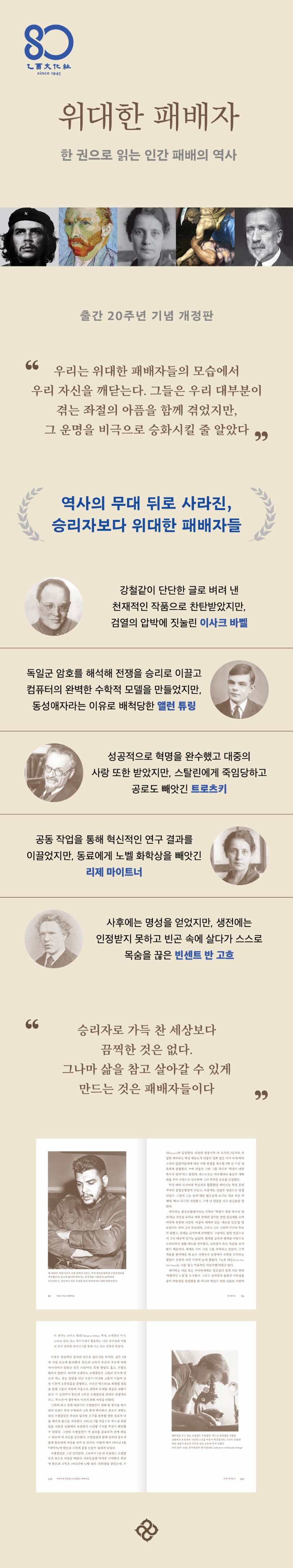 2005년 출간돼 많은 언론의 주목과 독자들의 호평을 받은 『위대한 패배자』가 출간 20주년을 맞아 개정판으로 새롭게 선보인다. 이번 개정판에서는 본문을 전반적으로 다듬으면서 낡은 표현을 바꾸고 불분명했던 부분을 보완했으며, 각주를 더하고, 도판 일부를 교체 및 추가했다. 이 책은 역사의 무대 뒤로 사라진, 승리자보다 위대한 패배자들을 새롭게 조명한다. 그들은 가장 찬란했던 순간에 질투로 눈먼 자의 모략으로 추락했고, 동료에게 업적을 빼앗기거나 본인이 판 구덩이로 걸어 들어갔다. 성공은 능력이나 노력만으론 얻을 수 없고, 인생은 마음먹은 대로 되지 않는다는 것을 우리는 안다. 눈부신 재능을 가진 그들의 삶도 예외는 아니었다. 이 책은 승리자보다 뛰어났지만 결국 패배하고 만 이들의 빛나는 업적과 아름다웠던 과정, 함께하는 사람들을 배려했던 마음, 죽는 순간까지 지켜 낸 굳은 신념을 기억한다. 그리고 그 기억은 그들에게 표하는 경의이자 우리에게 위안이 된다.