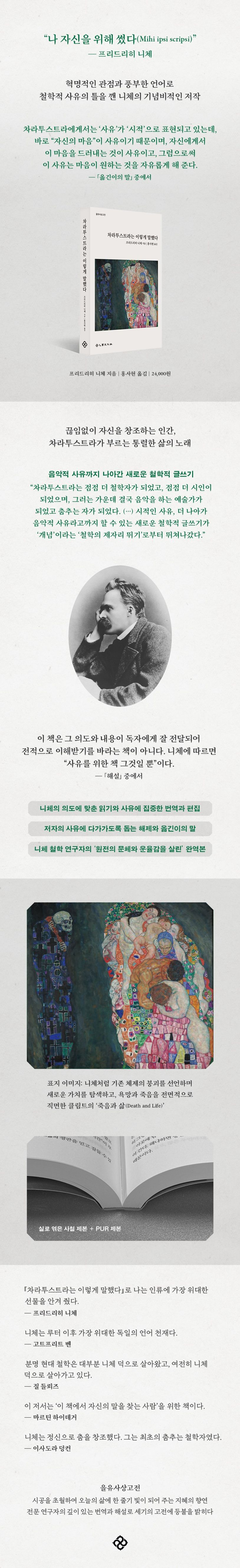 혁명적인 시각과 풍부한 언어로 철학적 사유의 틀을 깬 니체의 기념비적인 저작 『차라투스트라는 이렇게 말했다』가 을유사상고전 시리즈로 출간되었다. 이 책은 “신은 죽었다”라는 파격적인 문장을 비롯해 위버멘쉬, 영원회귀, 힘에의 의지 같은 니체 사상의 정수가 담긴 그의 대표작이다. 본서는 니체 철학 연구자 홍사현 교수가 오랜 연구를 바탕으로 완역한 것으로, 원서의 문체와 운율감을 살리고 독자들이 니체의 사유를 온전히 받아들일 수 있도록 심혈을 기울였다. 또한 이 저서는 이해받기를 바라는 책이 아닌 “사유를 위한 책”이라고 한 니체의 의도에 맞춰 독자들이 오롯이 읽고 사유할 수 있도록 하되 본문 뒤에 니체의 사유를 더 깊이 이해할 수 있게 돕는 ‘해설’과 ‘옮긴이의 말’을 실었다.
