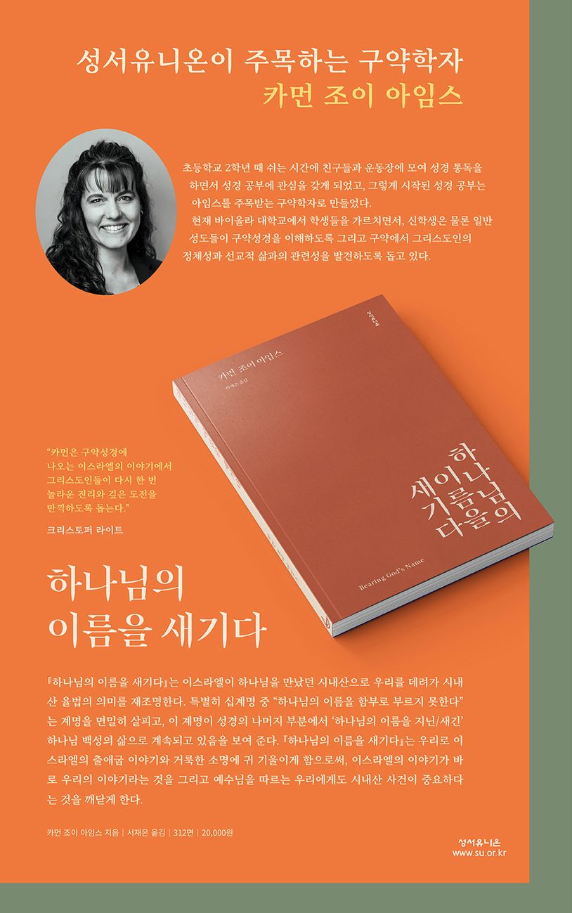 『하나님의 이름을 새기다』는 그리스도인에게 구약성경, 특히 시내산 율법의 중요성을 설명하면서 그 의미를 재조명한다. 먼저 십계명 중 “하나님의 이름을 함부로 부르지 못한다”는 계명을 면밀히 살피고, 이 계명이 성경의 나머지 부분에서 ‘하나님의 이름을 지닌/새긴’ 하나님 백성의 삶으로 계속되고 있음을 보여 준다. 이 책은 신구약의 연속성을 강조하고, 독자들로 하여금 이스라엘의 이야기가 바로 우리의 이야기라는 것을 그리고 예수님을 따르는 우리에게도 시내산 사건이 중요하다는 것을 보여 줌으로써, 시내산 언약과 이스라엘의 이야기를 통해 오늘 우리의 삶을 바로잡도록 도전한다.