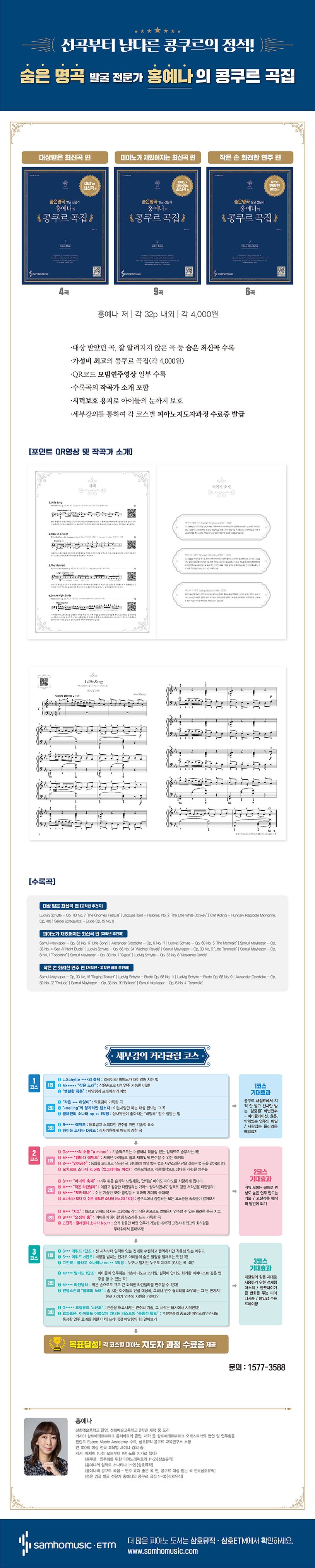 숨은 명곡 발굴 전문가 홍예나의 콩쿠르 곡집은, 콩쿠르에서 대상 받았던 최신곡, 듣기엔 화려해 보이지만 쉬운 손 쓰임새로 연주 효과를 극대화 할 수 있는 곡, 지금껏 잘 알려지지 않았던 숨어있는 명곡들을 실었습니다. 모범연주가 필요한 곡에는 저자가 직접 연주한 QR 영상이 포함되어 있어, 곡의 포인트나 주의해야 하는 부분들을 쉽게 파악할 수 있습니다. 책마다 작곡가 소개를 포함하였고, 시력보호 용지를 사용하여 아이들의 눈까지 보호해 줍니다.