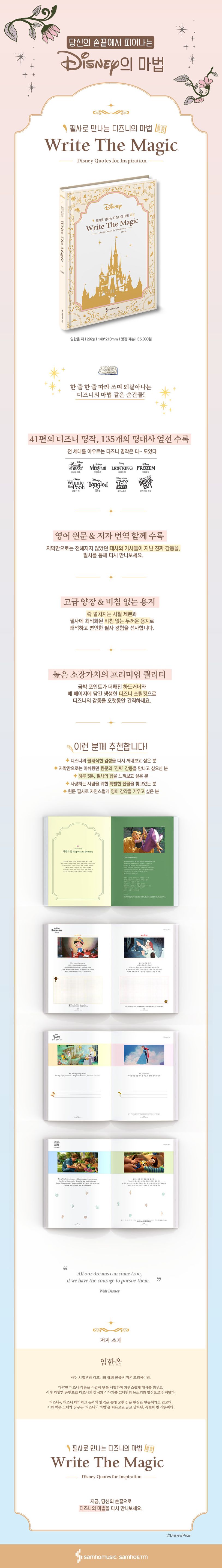 전 세대를 사로잡은 디즈니의 명작을 한 권에 담은 〈필사로 만나는 디즈니의 마법 Write The Magic〉 은 디즈니를 대표하는 41편의 애니메이션 작품 속 명대사 135개를 엄선해, 한 줄 한 줄 따라 쓰며 영화 속 감동의 순간을 다시금 되새길 수 있도록 기획되었습니다.