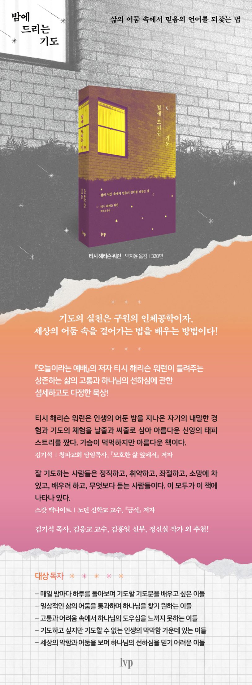 평범한 일상 아래 짙게 드리운 인생의 그림자를 예전과 교회의 전통이라는 토대 위에서 다루는 책이다. 『오늘이라는 예배』에서 평범한 하루를 예배로 살아 내는 법을 알려 준 티시 해리슨 워런은, 이 책 『밤에 드리는 기도』에서 우리가 매일 밤 잠자리에 들 때 직면하는 인생의 민낯을 조명한다. 불안과 두려움, 질병과 죽음에 이르기까지, 우리는 주위의 어둠처럼 늘 도사리고 있는 삶의 위험을 통제할 수 없다. 저자는 기도조차 할 수 없는 고통의 시기를 통과하며 ‘밤기도’라는 교회의 전통을 깊이 묵상함으로, 인생의 고난을 막지 않으시는 하나님을 우리가 어떻게 신뢰하고 그분으로부터 위로를 얻을 수 있는지 보여 준다.