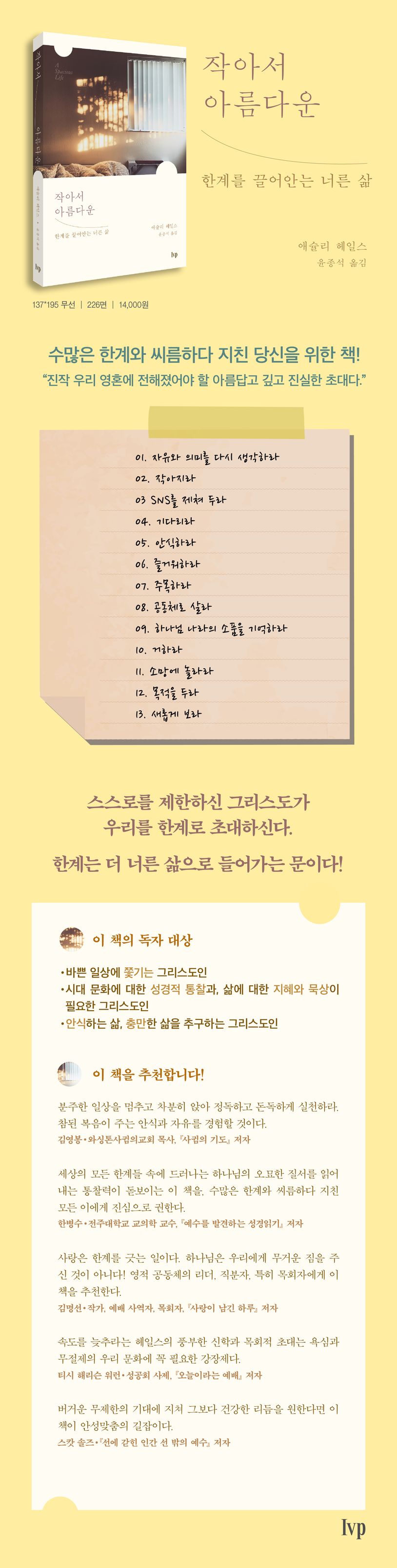 우리의 한계와 약점을 성공의 ‘걸림돌’이 아니라 우리를 형통하게 하는 ‘선물’로 받아들인다면 어떤 일이 일어날까? 저자 애슐리 헤일스는 한계를 인정하면 삶의 외연이 오히려 더 확장되는 것을 경험한다고 역설한다. 하나님이 지어 주신 한계 안에서 사는 것이 인간 본연의 삶이자 예수가 본을 보이신 삶임을 드러내고 그 삶으로 초대한다. 자유와 의미를 다시 생각하라, 작아지라, SNS를 제쳐 두라, 안식하라, 주목하라, 공동체로 살라…. 저자는 총 열세 장의 초대장을 하나하나 내밀며 우리 삶의 통제권을 내려놓고 우리의 인도자 하나님께 자신을 내어 맡기라고 말한다. 모든 초대장은 깊고 진솔한 기도로 끝을 맺어 홀로 하나님을 묵상하거나 작은 모임에서 함께 나누고 기도할 수 있도록 안내한다.