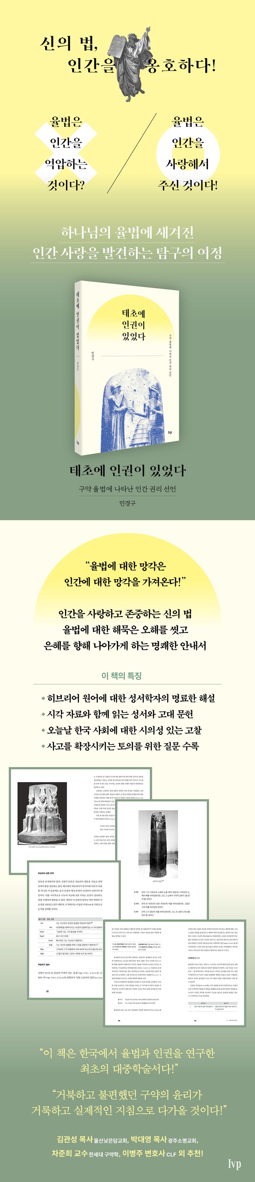 구약의 율법에 나타난 인권 보호의 메시지를 살펴보는 최초의 대중학술서. 성서학자인 저자는 율법에 대해 만연한 오해, 곧 율법이 인간을 억압하는 도구이며 은혜를 가로막는 걸림돌처럼 여겨지는 경향성에 단호히 ‘아니다!’라고 답한다. 오히려 하나님이 주신 율법은 인간을 사랑하라는 인권 존중의 명령임을 밝히고, 한국 교회에 만연한 율법에 대한 망각이 곧 성서가 옹호하는 인권에 대한 망각을 가져왔다고 주장하며, 그동안 조명되지 않았던 율법의 정신을 올바르게 받들어 지킬 것을 설파한다. 자유, 인애, 정의를 수호하고 더 나아가 은혜를 향해 가는 율법의 세계로 독자를 초대한다.
