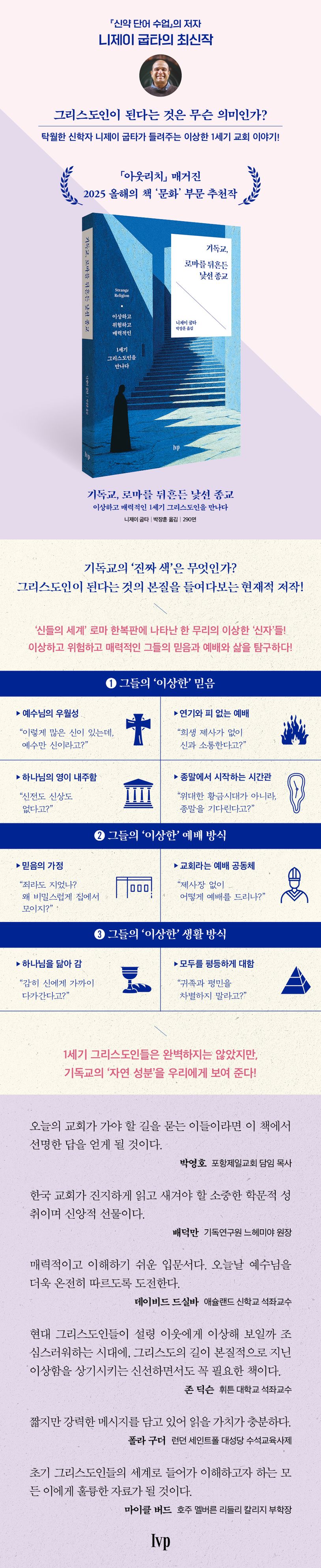 탁월한 신약학자이자 『신약 단어 수업』의 저자 니제이 굽타가 이번에는 기독교 신앙의 본질을 역사적으로 톺아본다. 저자는 1세기 그리스도인의 믿음과 실천을 탐사하여 그리스도인 됨의 본질을 회복하고자 한다. 1세기 그리스도인의 믿음과 예배는 어떤 면에서 당대 로마 사회에 ‘낯선’ 것이었을까? 저자는 면밀한 시선으로 로마 사회와 1세기 기독교의 모습을 비교하여 살피면서, 당대에 예수 추종자들이 왜 이상하고 위험하면서도 매력적인 존재로 비쳤는지 설명한다. 저자가 보여 주는 기독교의 ‘길들여지지 않은’ 본질은 오늘날 너무도 익숙해진 기독교에 낯섦을 불어넣어, 우리의 신앙을 새로운 눈으로 돌아보게 할 것이다.