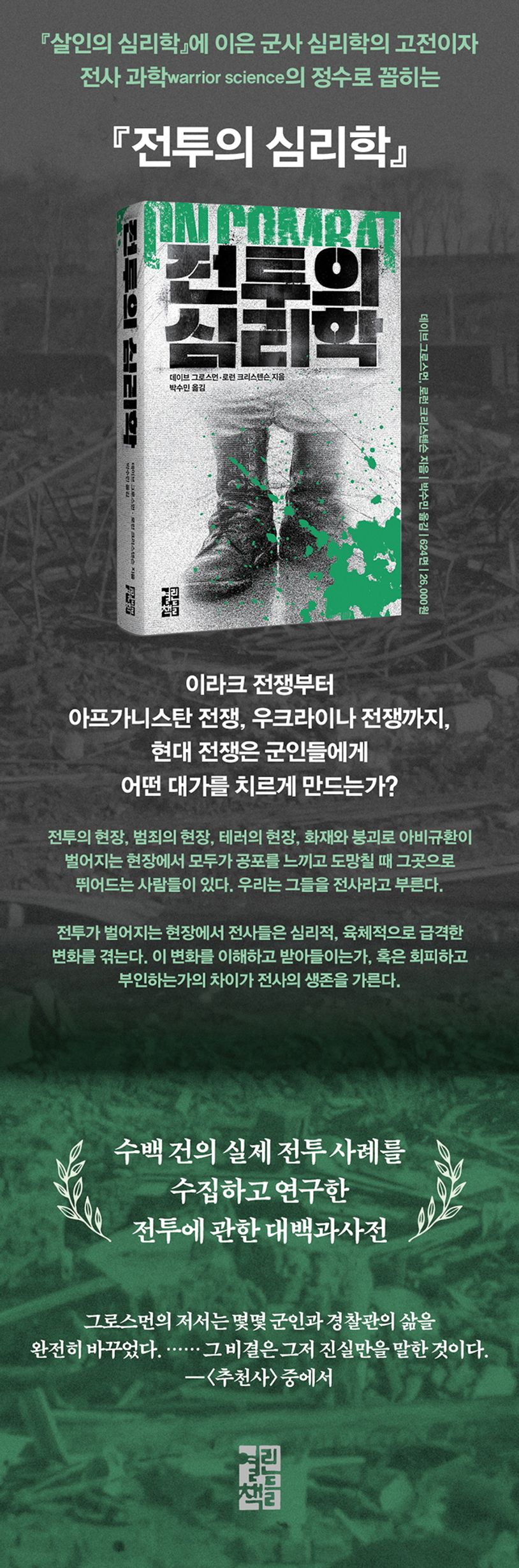 눈앞에 있는 적군을 향해 방아쇠를 당길 수 없던 군인들의 이야기, 인간의 본성 깊숙한 곳에 숨어 있는 살인에 대한 거부감, 누구나 불편해하는 주제인 살인에 대해 연구하면서 살해학killology이라는 새로운 분야를 개척하여 퓰리처상 후보에 오른 문제작 『살인의 심리학』의 저자 데이브 그로스먼이 전투에 대해 다룬다. 『전투의 심리학』은 20년간 미 육군에서 복무한 예비역 중령인 데이브 그로스먼과 30년간 경찰 및 군 생활에 헌신한 로런 크리스텐슨, 두 베테랑이 현직에 근무하고 있는 군인, 경찰이 경험한 수백 건의 실제 전투 사례를 수집하고 문헌 연구를 통해 체계화시킨 전투에 관한 대백과사전이다.