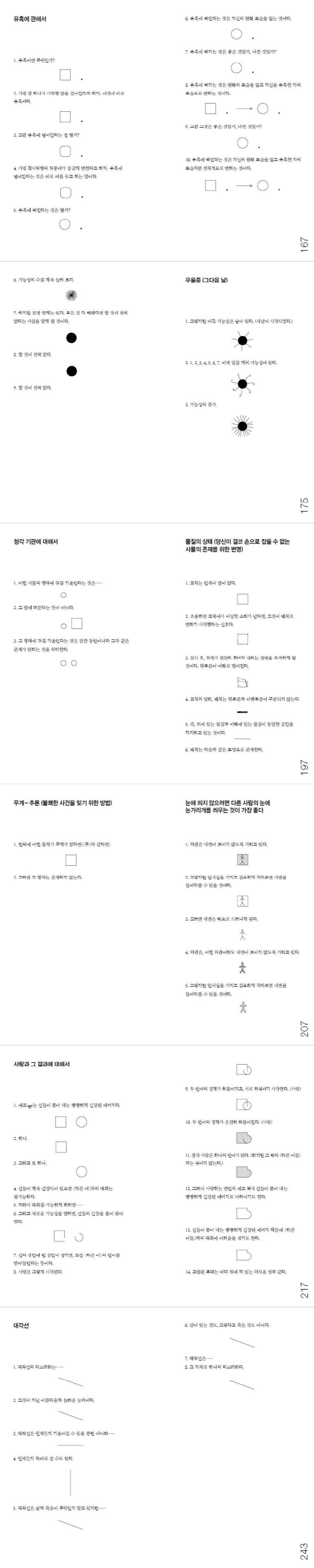 책에 등장하는 작가는 폴 발레리, 이탈로 칼비노, 로베르트 발저, 칼 크라우스, 앙드레 브르통, 베르톨트 브레히트, 로베르토 후아로스, 앙리 미쇼, 에마누엘 스베덴보리, T. S. 엘리엇까지 총 열 명이다. 그 거장들이 한동네에 모여 산다면 그 안에서 어떤 이야기가 펼쳐질 수 있을까? 독자들은 사색으로 풍성한 칼비노 씨의 산책에 동행하기도 하고, 브레히트 씨의 무대나 엘리엇 씨의 강연회를 자유롭게 드나들 수도 있다. 그 밖에도 감초 같은 조연처럼 동네 곳곳에서 주인공 작가들과 예기치 않게 조우하는 마르셀 뒤샹, 앤디 워홀 등의 예술가들을 만나는 것도 작가들이 사는 동네를 방문한 독자들에게 빼놓을 수 없는 재미다.