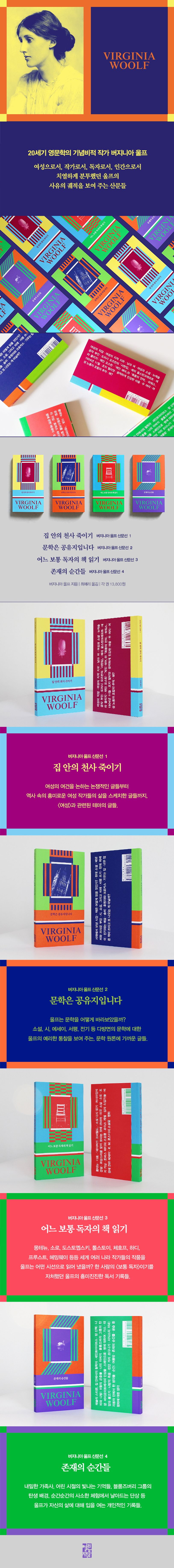 총 4권으로 편성하여, 페미니즘적 이슈나 여성 문학론 등 여성과 관련된 테마의 글들을 제1권(『집 안의 천사 죽이기』), 문학에 대한 울프의 생각을 보여 주는 문학 원론에 가까운 글들을 제2권(『문학은 공유지입니다』), 한 사람의 독자로서 울프가 읽은 개별 문학 작품 및 작가에 대한 글들을 제3권(『어느 보통 독자의 책 읽기』), 울프 자신의 삶이 담겨 있는 개인적인 수필이나 자전적인 글들을 제4권(『존재의 순간들』)으로 엮었다. 이런 여러 면모를 통해 버지니아 울프를 여성으로서, 작가로서, 독자로서, 인간으로서 유기적으로 이해할 수 있는 시야를 제공하고자 했다. 또 권별로 역자의 충실한 해설을 달아, 울프의 사유가 나아간 궤적들을 독자들이 그려 보는 데 도움을 줄 수 있도록 했다.