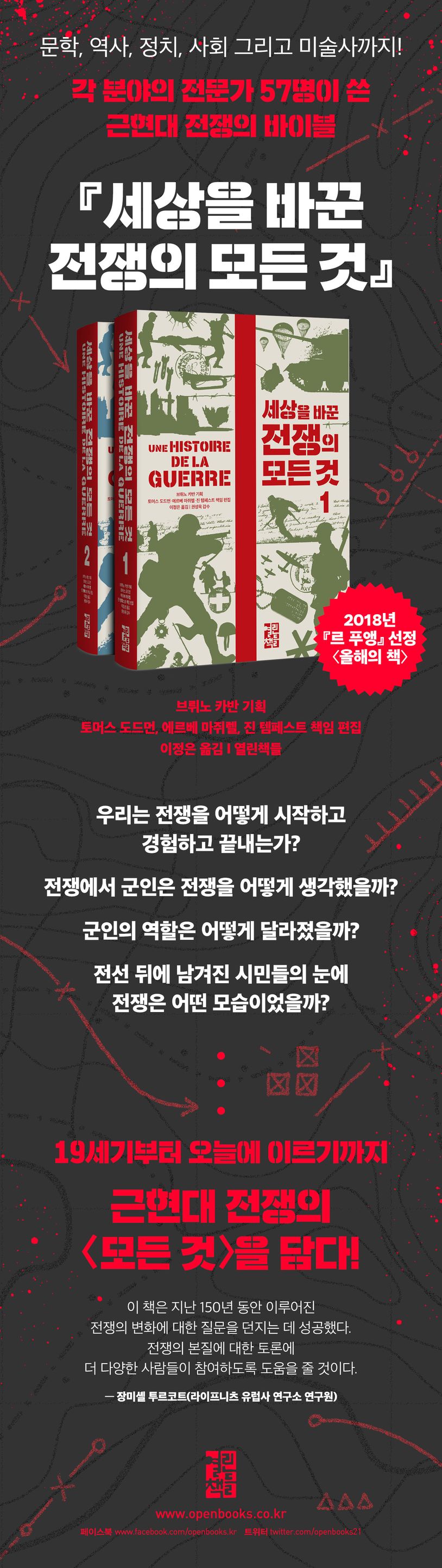 『세상을 바꾼 전쟁의 모든 것』은 5개국의 분야별 전문가 57인이 참여하여 근현대 전쟁의 변화, 변화 속에서 달라진 인간의 삶과 윤리적, 사회적 문제를 총망라한 책이다. 1권에서는 1부 「근대 전쟁의 탄생」과 2부 「군대의 세계」를 담고 있다.