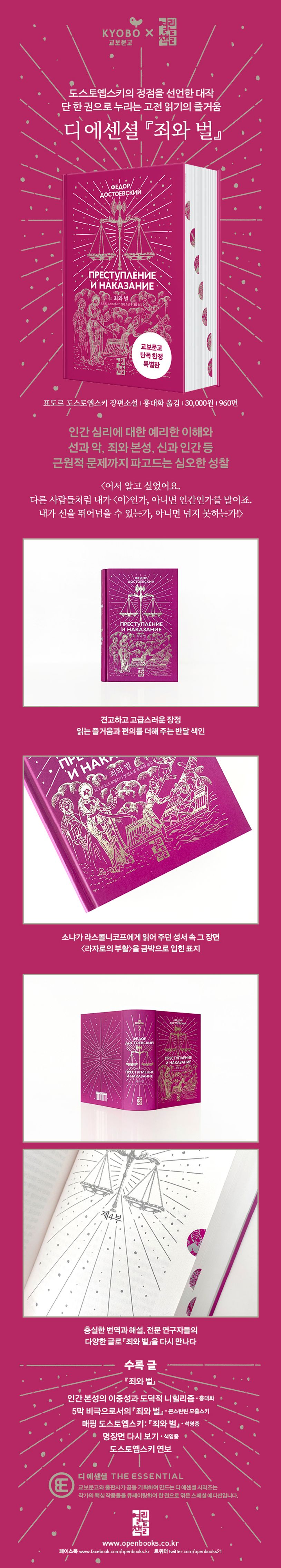 이번 디에센셜 『죄와 벌』은 묵직한 고급 장정에 언제든 찾아보기 쉽게 반달 색인을 넣어 한 권으로 대가의 작품을 오롯이 음미할 수 있도록 꾸렸다. 표지 그림으로는 소냐가 라스콜니코프에게 읽어 주는 〈라자로의 부활〉 장면을 그린 성화를 금박으로 새겨 불멸의 고전을 소장하는 즐거움을 더해 준다.