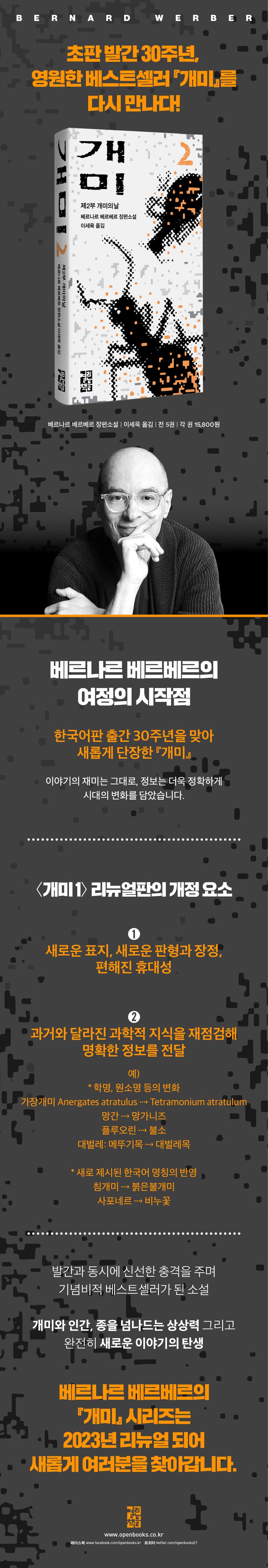 발간과 동시에 신선한 충격을 주며 기념비적 베스트셀러가 된 『개미』가 새로운 얼굴로 독자들을 다시 만난다. 개미라는 작디작은 생명체의 눈으로 바라본 흥미로운 인간의 모습과, 개미와 인간 세계를 오가는 장대한 모험을 담은 이 이야기는 여전히 여느 작품이 넘볼 수 없는 독창성과 상상력, 재미를 보장한다. 개미와 인간, 각각의 세계를 덮친 위험을 뒤쫓다가 그 길에서 서로의 존재를 발견하게 되는 1부 「개미」(1권), 개미와 인간의 직접적인 조우가 일으킨 갈등과 폭력, 그리고 종간의 화해를 모색하는 이들의 노력을 그린 2부 「개미의 날」(2, 3권), 개미들에게 감화받아 개미 혁명을 시작하려는 사람들의 이야기인 3부 「개미 혁명」(4, 5권)까지, 베르베르는 정교한 미스터리와 거대한 스케일, 천재적인 상상력으로 독자들을 이 방대하고 생생한 활극의 대단원까지 거침없이 이끌어 나간다.