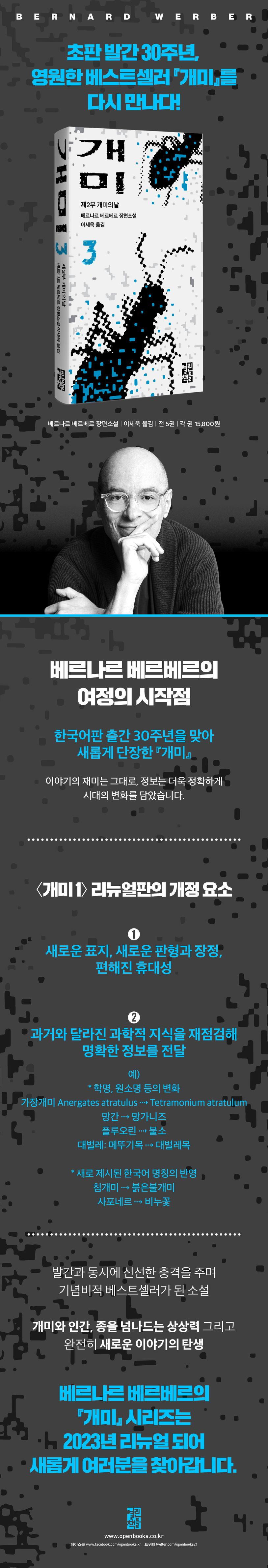 한국어판 출간 30주년을 맞아 새로운 판형과 장정으로 단장한 『개미』는 작품의 매력은 그대로, 책의 만듦새는 더욱 가볍게, 더욱 현대적으로 선보인다. 내용 역시 손봐 그간의 맞춤법 변화를 반영하고, 다채로운 지식 정보들 역시 새롭게 점검해 이야기의 재미는 그대로 살리되 한층 더 정확하게 전달할 수 있도록 새로 다듬었다.