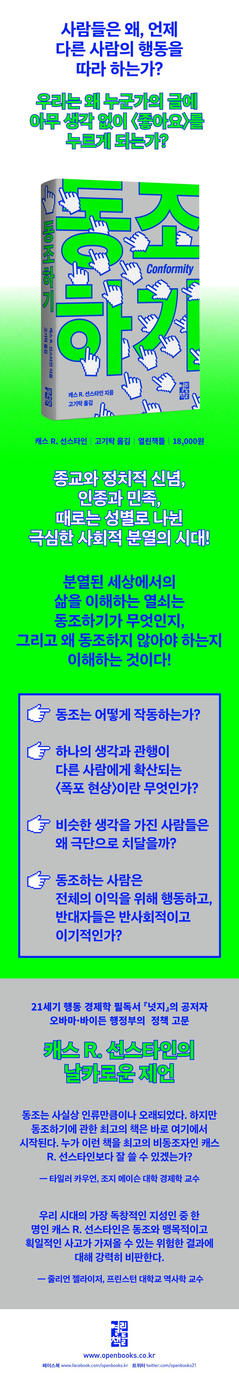 우리는 사람들을 종교와 정치적 신념, 인종과 민족, 때로는 성별로 나누면서 극심한 사회적 분열의 시대에 살고 있다. 어쩌다가 이렇게 되었을까? 『동조하기』에서 캐스 R. 선스타인은 이처럼 분열된 세상에서의 삶을 이해하는 열쇠가 동조-동조가 무엇이고 어떻게 작용하는지-에 대한 이해와 반대 의견이 가지는 대항력에 대한 이해에 있다고 주장한다. 왜, 그리고 언제 사람들은 다른 사람의 행동을 따라 할까? 자신이 옳다고 확신할 때 사람들은 더 적극적으로 최선이라고 생각되는 행동을 하고, 대중의 의견을 거부하려 한다. 개개인의 관점에서 〈동조하기〉는 대개 이성적인 행동의 과정이지만, 우리 모두가 또는 대다수가 동조하고 천편일률적으로 사고할 때 사회는 큰 실수를 범할 수 있다. 사람들이 동조하는 이유 중 하나는 정보(건강이나 투자, 법률, 정치)가 자주 부족할 때 어떻게 해야 할지와 관련해서 타인의 판단이 최선의 정보를 제공하기 때문이다. 게다가 많은 사람에게 일반적으로 인터넷이, 특히 소셜 미디어가 전에 없던 동조 압박을 가할 수 있음은 의심의 여지가 없다. 온라인 커뮤니티 속 사람들이 특정한 성향을 보일 때도 우리는 그들에게 동조하거나, 적어도 이의를 제기하지 않으려 한다. 게다가 많은 경우에 사람들은 다른 사람이 자신을 어떻게 생각하는지도 신경 쓴다. 이런 현상은 우리에게 동조하는 경향이 있음을 의미한다. 지금 이 순간에도 우리는 온라인에서 많은 시간을 보내고 있고, 어떤 면에서는 전 세계가 우리의 손안에 있는 셈이다. 하지만 인터넷은 헛소리가 넘쳐 나는 곳이다. 그러므로 쉽게 동조하는 성향을 가진 사람이라면 무엇을 따를지 또는 누구를 따를지 결정하기 전에 상당한 선행 작업을 수행할 필요가 있다.