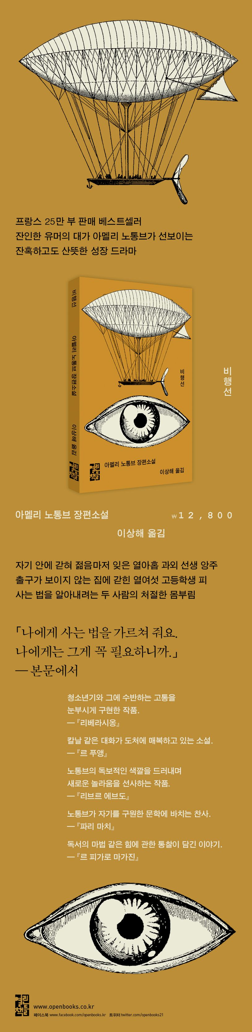 잔인함과 유머를 완벽하게 혼합해 독보적인 작품 세계를 구축해 낸 아멜리 노통브. 데뷔 이래 한 해도 빠짐없이 매년 하나의 작품을 발표해 온 그의 스물아홉 번째 소설 『비행선』이 열린책들에서 출간되었다. 『비행선』은 프랑스에서만 25만 부가 판매되며 베스트셀러에 오른 작품으로, 문학과 젊음이라는 주제를 중심으로 잔혹하고도 산뜻한 드라마를 펼쳐 보인다.