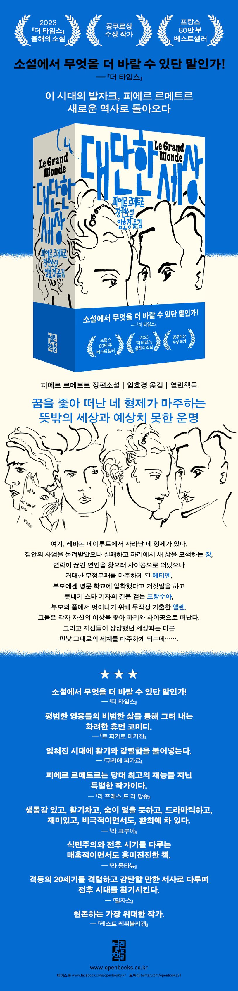 이 시대의 발자크로 칭송받는 거장 피에르 르메트르의 신작. 르메트르는 이미『오르부아르』를 비롯한 〈재앙의 아이들〉 3부작으로 제1차 세계 대전과 제2차 세계 대전까지의 시기를 다룬 바 있다. 『대단한 세상』은 새로운 4부작의 시작으로, 레바논 베이루트에서 태어나 자란 네 형제를 주인공으로 하여 펼쳐진다. 이 소설은 아직 전후의 혼란이 수습되지 않은 이 시기의 혼란스러운 프랑스 사회를 낱낱이 보여 준다.