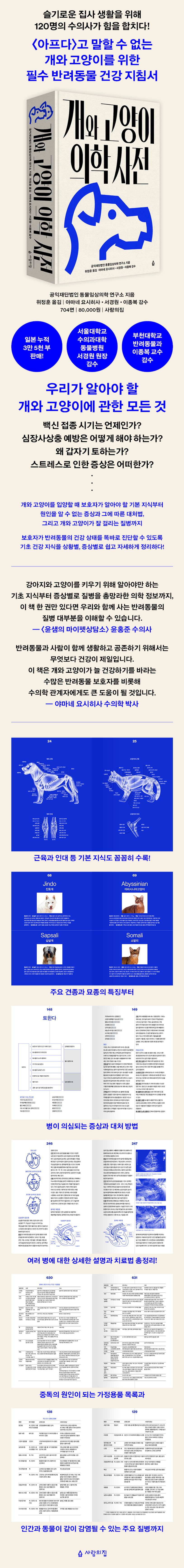 개와 고양이는 〈반려동물〉이라고 부르는 명칭에서 알 수 있듯이 우리 삶에 없어서는 안 될 존재다. 사람과 같은 공간에서 함께 숨 쉬고 밥을 먹고 잠자는 반려동물은 우리와 함께 살면서 사람처럼 나이가 들고 병이 생기는 고령화 시대도 같이 맞이하고 있다. 즉 보호자와 반려동물이 함께하는 기간이 길어졌다는 말이다. 『개와 고양이 의학 사전』은 반려동물이 사람과 함께 생활하고 공존하기 위해 가장 중요한 〈건강〉을 위해 그야말로 머리부터 발끝까지 개와 고양이에 관한 모든 질병을 다룬 의학 대백과 사전이다. 일본에서 반려동물 연구와 활동에 관해 국가로부터 공익재단법인으로 인정받은 동물임상의학 연구소가 수의사 120명에게 집필을 의뢰하여 한 권으로 묶은 『개와 고양이 의학 사전』은 개와 고양이를 기르는 모든 보호자가 알아야 할 내용을 704쪽이라는 방대한 양으로 빼곡하게 채워 넣은 책이다. 처음 강아지나 새끼 고양이를 집에 데려올 때, 혹은 보호소에서 데려온 성견이나 길고양이를 입양할 때 보호자가 알아야 할 기본 지식부터 실제로 개와 고양이를 키우면서 일어나는 수많은 증상과 대처법, 그리고 개와 고양이가 잘 걸리는 질병까지 책을 읽는 보호자가 잘 이해하도록 알기 쉽게 풀어서 설명한다. 또한 일반 보호자뿐 아니라 수의사와 수의학과 학생, 반려동물 연구자 등 넓은 범위를 대상으로 했기에 난이도에 따라 단계적으로 구성되어 있다.